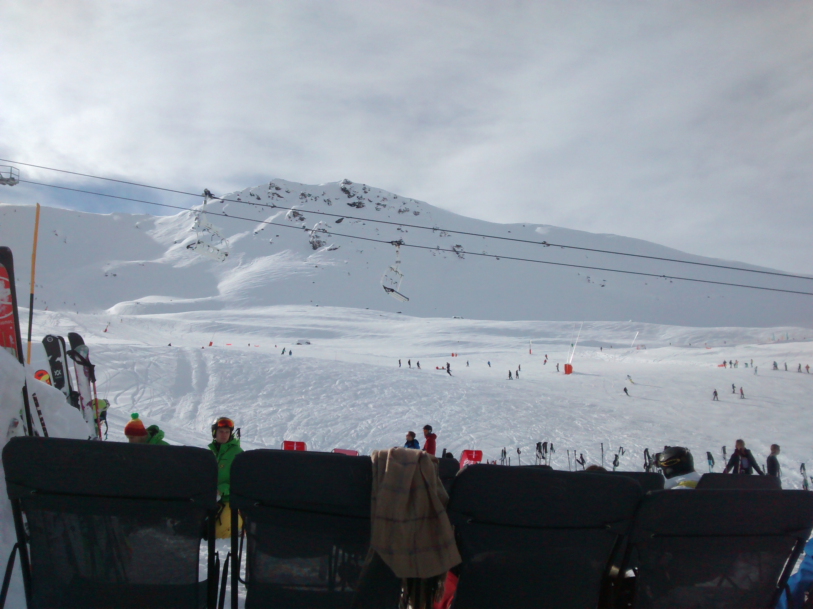 Mais pourquoi aller plus haut alors qu'ici , il y a sur la piste un restaurant bien assis, terrasse au soleil, avec des pros ...