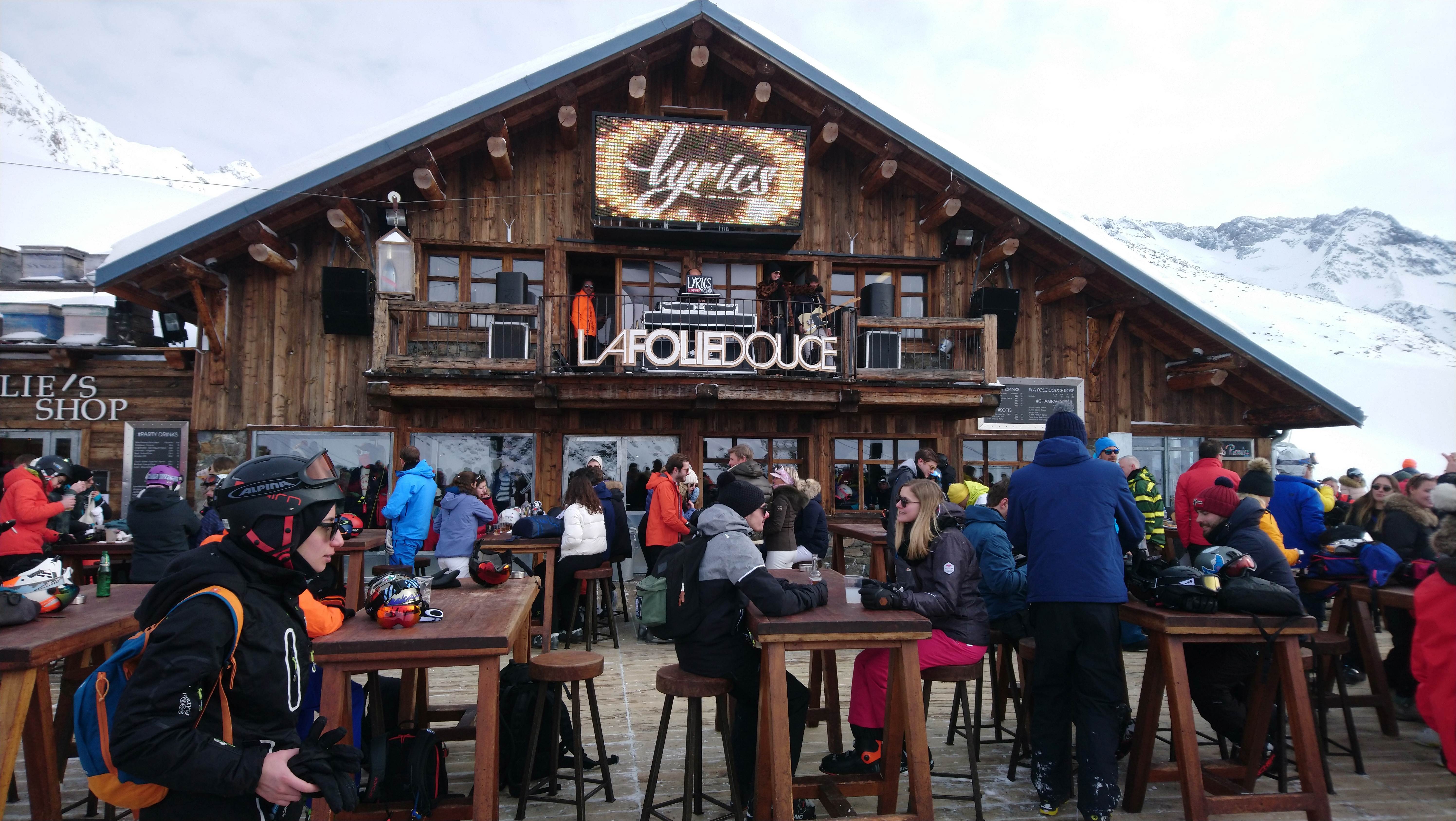 Grosse soirée le vendredi en fin de journée, ferme plus tard (entre 18h30 et 19h) que la folie douce(17h), donc a privilégier, clientèle plus jeune, internationale et qui est bien décidée à s amuser après le ski, la music est vraiment cool, faut par arriver après 16h30 car ensuite la queue est longue et l entrée improbable, pas mal de monde monte directement à pied de la station, j avoue que la descente en ski de nuit en ayant quelque coups dans le nez rends l expérience incontournable, ça vide des bouteilles de rosé a un rythme incroyable, le sol finit par être recouvert de bouteilles, amusant