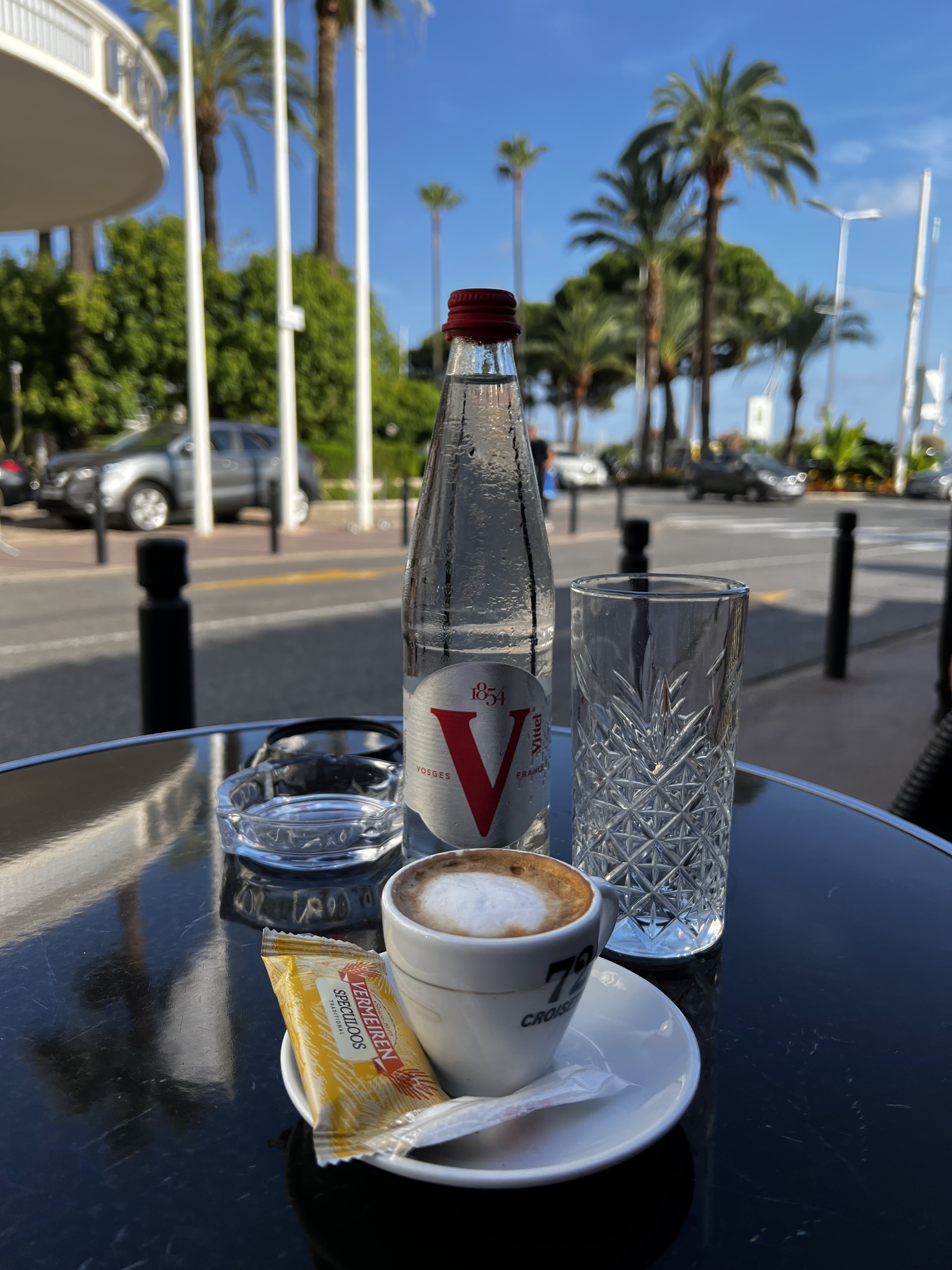 J aime ce beau café qui se trouve en face de l hôtel le Martinez où il y a un défilé de voitures somptueuses. Les serveurs du 72 Café sont sympathiques. Avec le café super bon il y a toujours un petit gâteau et un verre d eau.