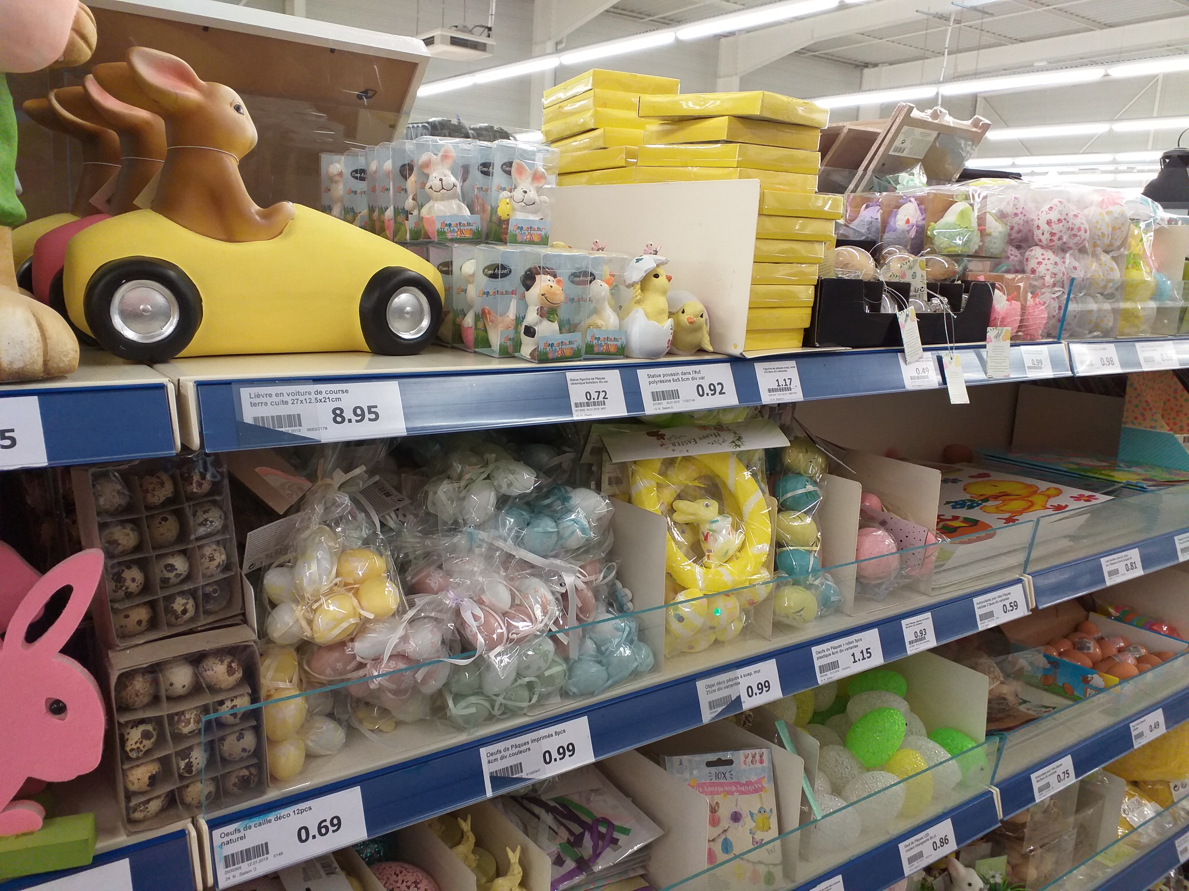 On peut y trouver de tout de A à Z nourriture des jouets des cadeaux des bibelots produits d'entretien produit pour la cuisine salle d'eau cahier décoration objet à peindre nous-même vêtements Sac portefeuille bijoux rayon pour les animaux rayon pour la beauté rayon pour les enfants aussi rayon pour voiture rayon pour fleur en fait on trouve de tout comme je vous ai dit de A à Z et le personnel est accueillant