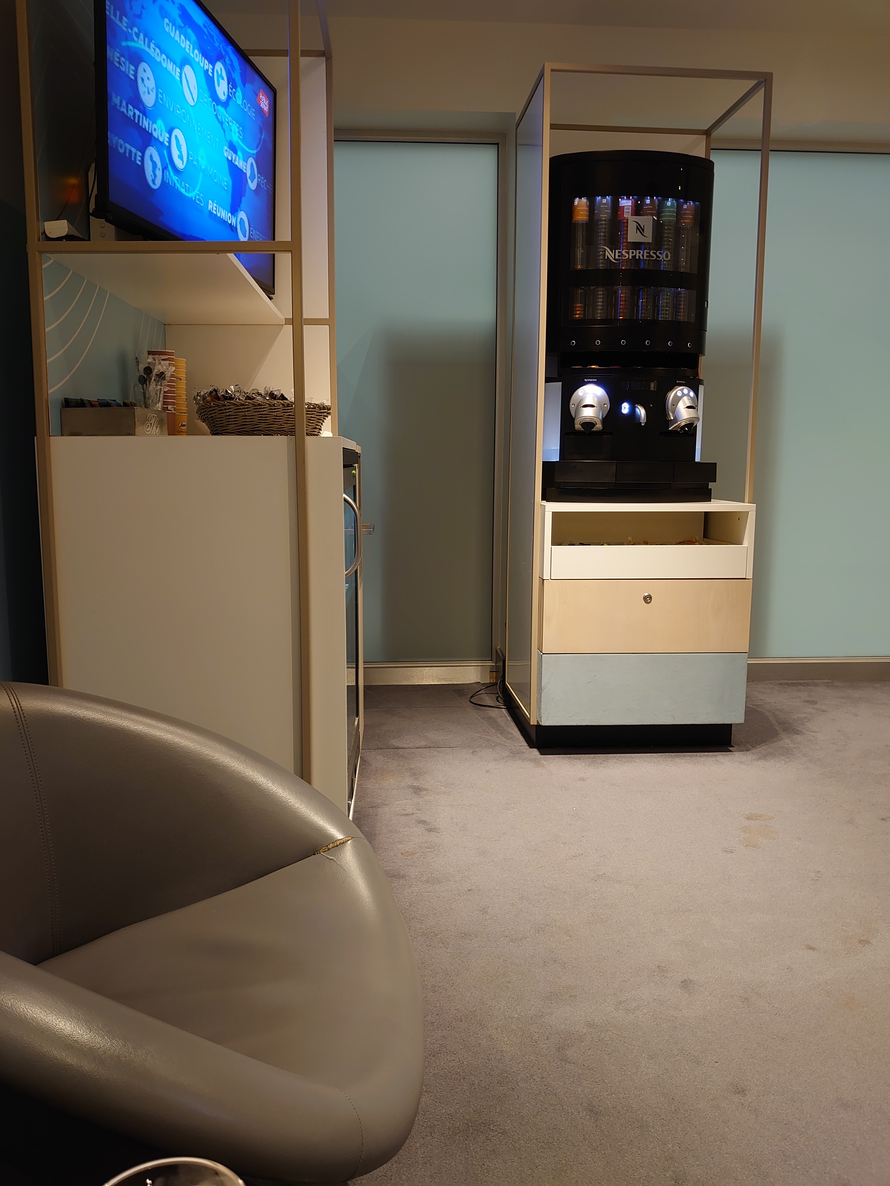 Le Salon est très proche des portes d’embarquement. Il a été rénové à l’été 2023, ce qui rend l’endroit très agréable, avec une déco moderne typique Air France, et plusieurs choix possibles pour se poser : canapé / banquette ; fauteuil ; chaise haute ; table de travail… Il y a des prises 220 et USB, du WIFI gratuit et un buffet basique de choses à grignoter : quelques biscuits, des pommes, des chips, des petits biscuits salés… ainsi que des machines Nespresso et un choix de cafés différents, des boissons fraîches, et des thés. En fonction de l’heure, on peut trouver tantôt des viennoiseries, tantôt de petits sandwiches salés. Toutefois, la variété et le choix sont assez basiques, et l’offre est très limitée par rapport à un salon Air France comme ceux de Charles de Gaulle, ou même Lyon… Comme toujours, l’accueil est très agréable, avec un personnel avenant sans en faire des tonnes. Il est possible d’obtenir des renseignements sur les vols, notamment en cas de perturbations météo ou de grèves. Une manière agréable de passer le temps en attendant l’embarquement.