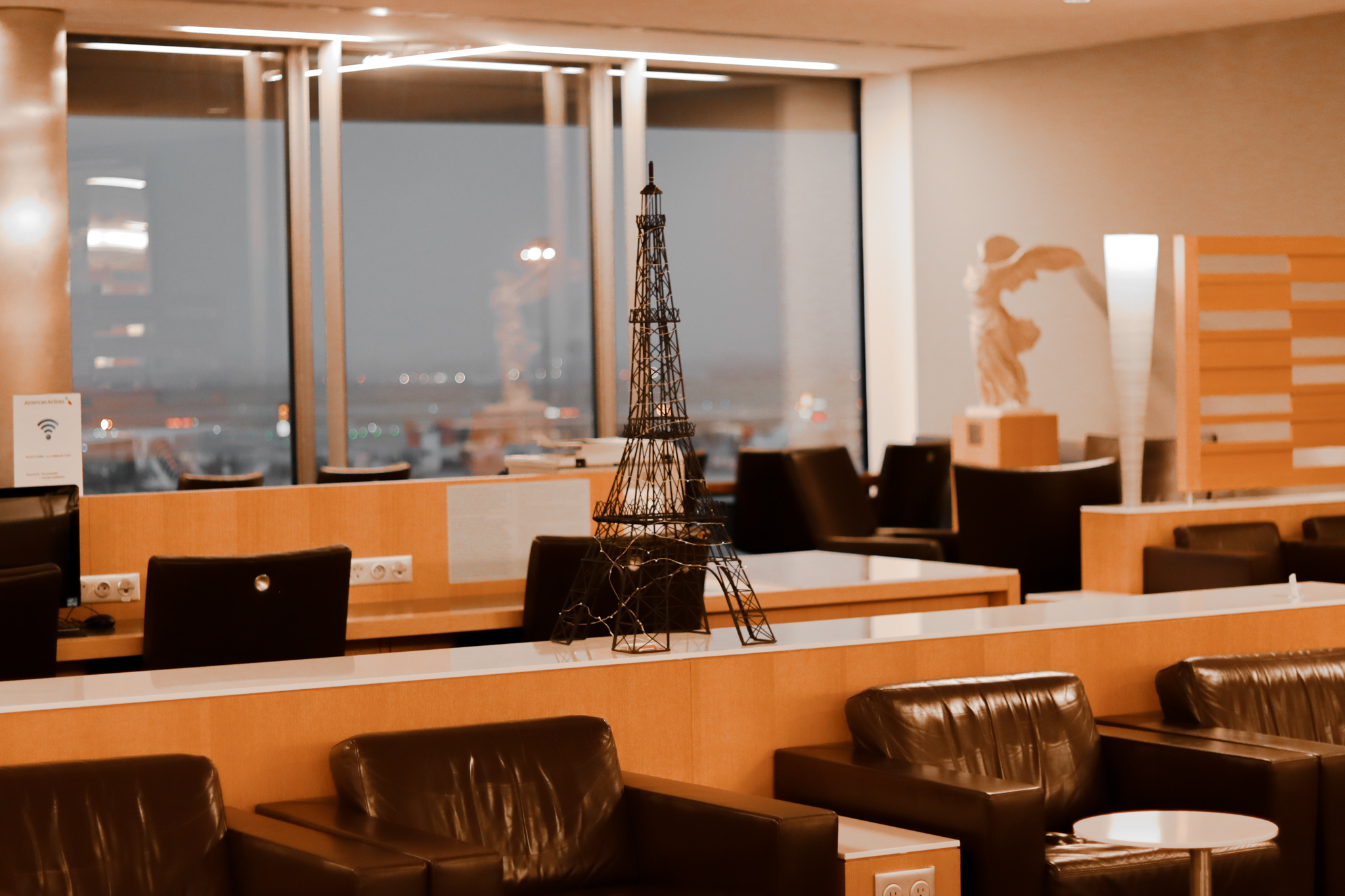 Club des amiraux d'American Airlines | CDG Terminal 2 Salon d'American Airlines, One World Group, bonne ambiance, sièges confortables, joliment décoré, nourriture délicieuse et personnel très mignon.