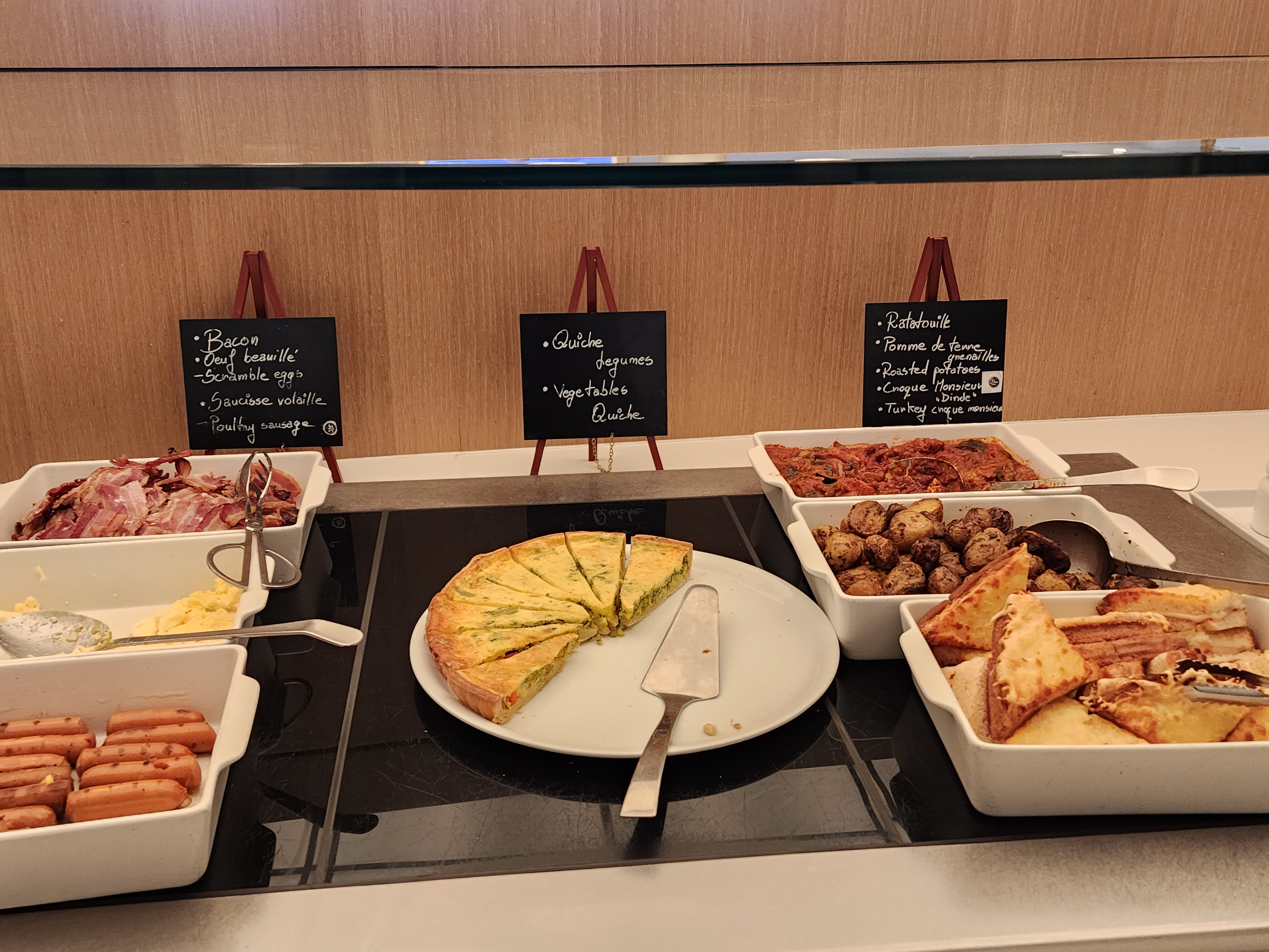 Il propose une variété de plats et de boissons parmi lesquels choisir, ainsi que de nombreux plats chauds. Il existe également une zone de fromages séparée parmi laquelle les clients peuvent choisir. Le design est très bon et l'environnement est confortable. En regardant vers l'extérieur, vous pouvez voir les avions sur le point de décoller, j'aime cet endroit.