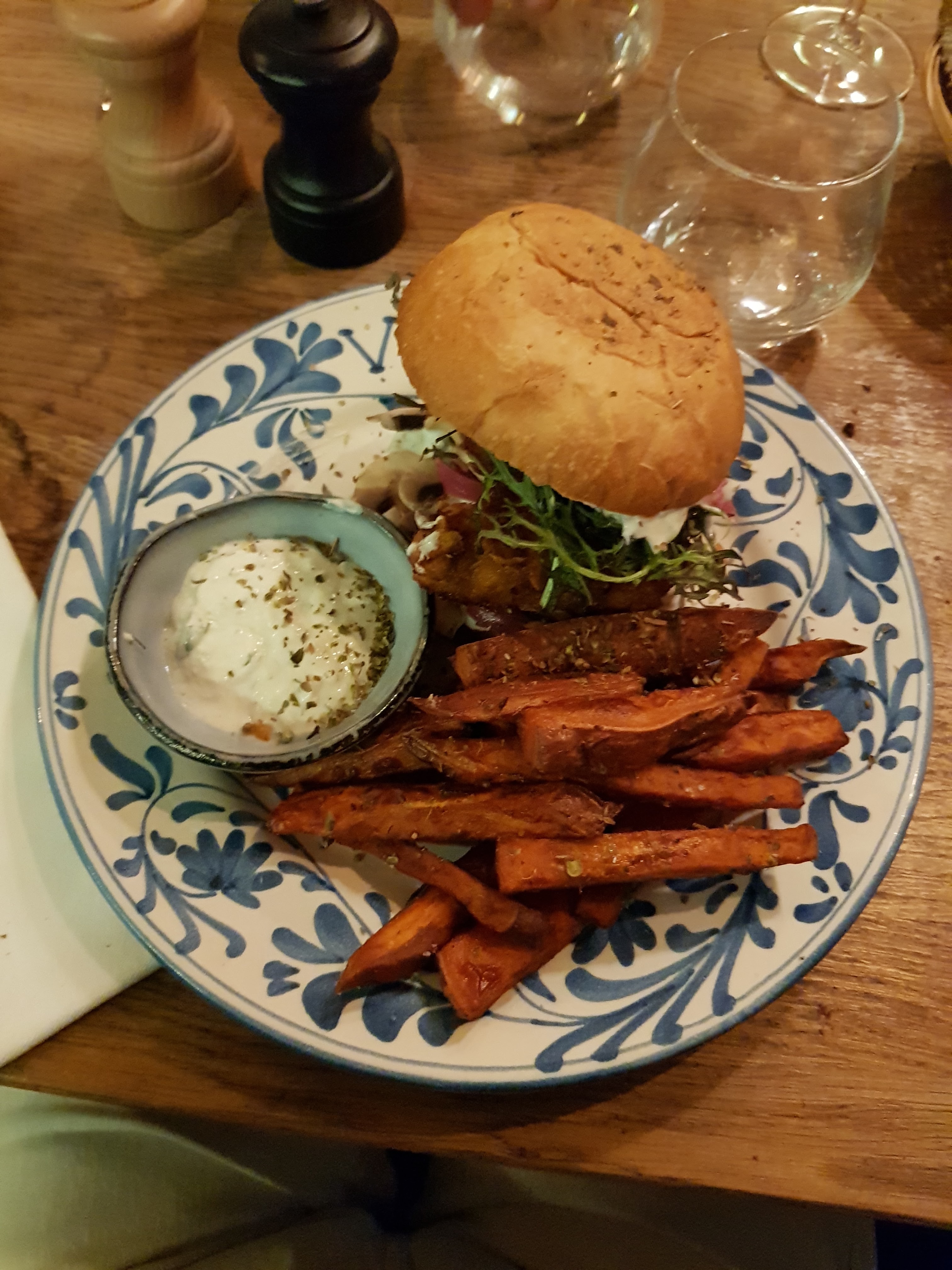 Décoration et lieu agréable Par contre le service laisse à désirer personnel non formé aux bases du métier (ne connaît pas sa carte les vins etc), ne nous demande pas si tout se passe bien en cours de service, on ne nous a d’ailleurs même pas proposé le dessert … on nous a un peu oubliées alors que le resto était loin d’être complet. Tapas de bonne qualité mais pas d’accompagnement pour aller avec : mis à part du pain. Pain guacamole c’est original mais on aurait préféré autre chose quand même ^^ burger un peu sec frites de patate douce très bonnes par contre.