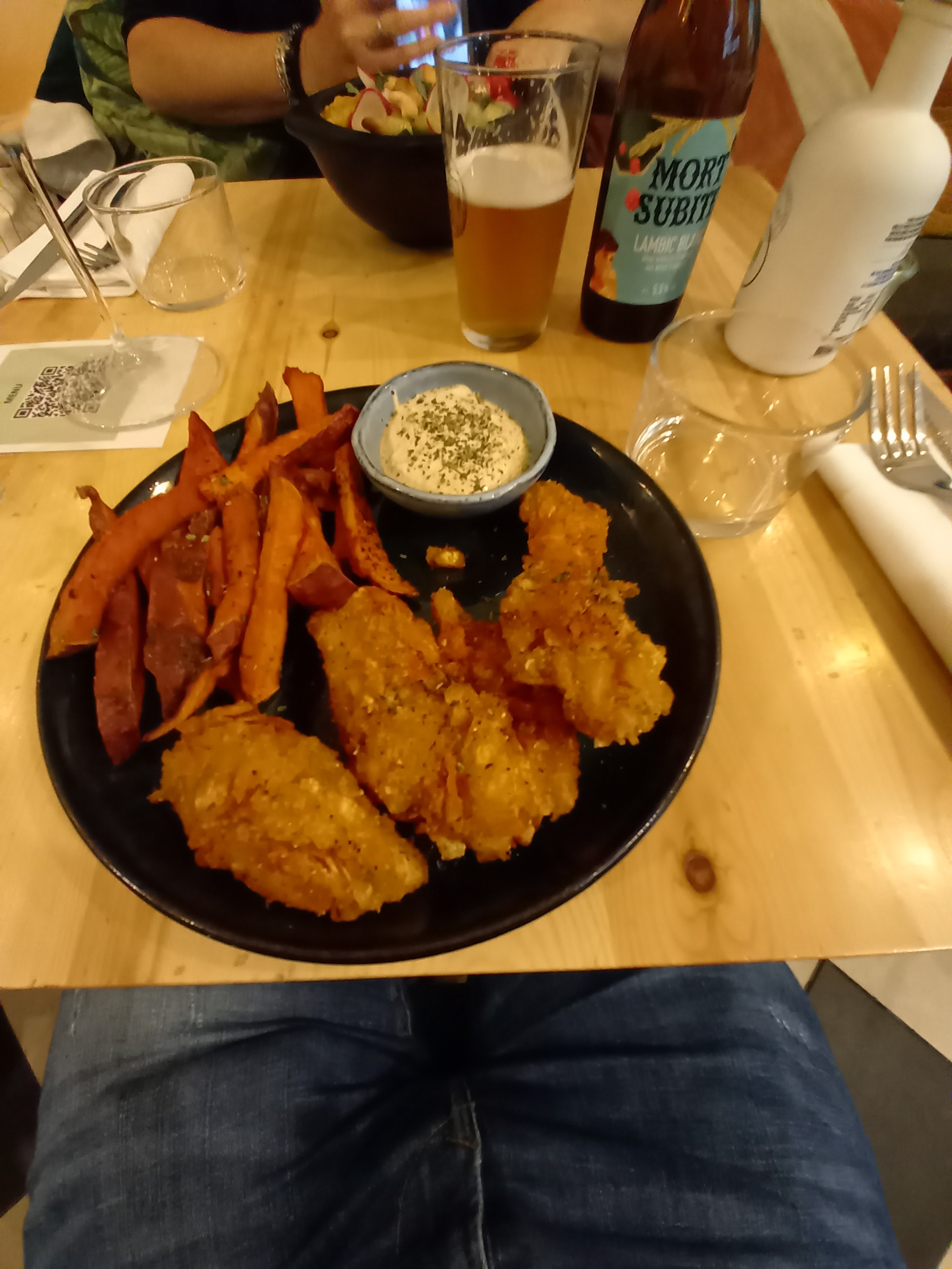 Belle ambiance, accueil sympathique, repas composé de fallafels, nuggets poulet et frites de patate douce sauce gribiche accompagné d’une bonne bière, je suis reparti rassasié 😊 juste déçu de pas avoir vu Juan et Laury😉je recommande aux amateurs de la cuisine healthy