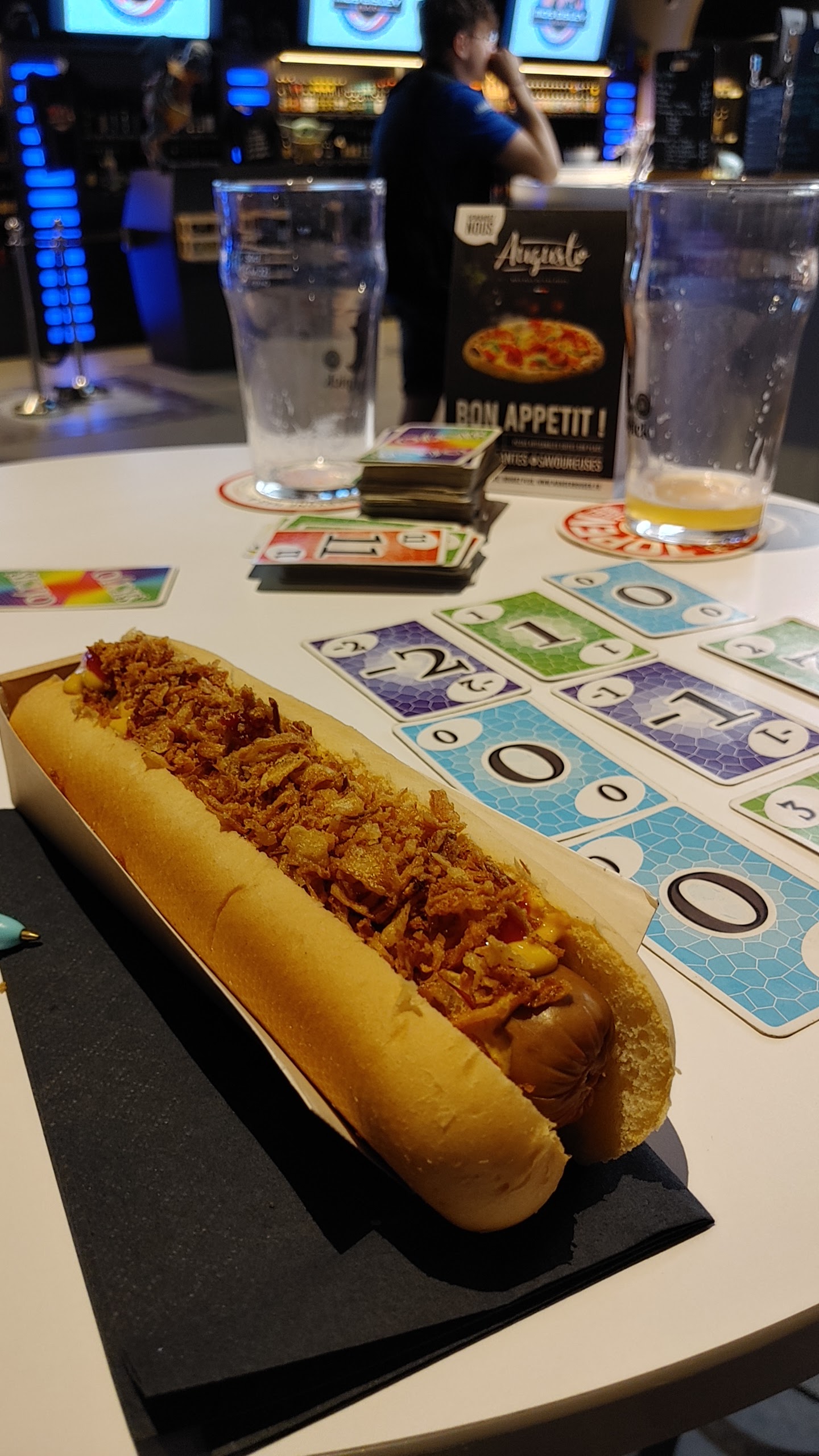 Très bon moments, bcp de choix niveau bière, pizzas, charcuterie, hot dog. Très bonne musique d'ambiance ou film sur GD écran. Super.