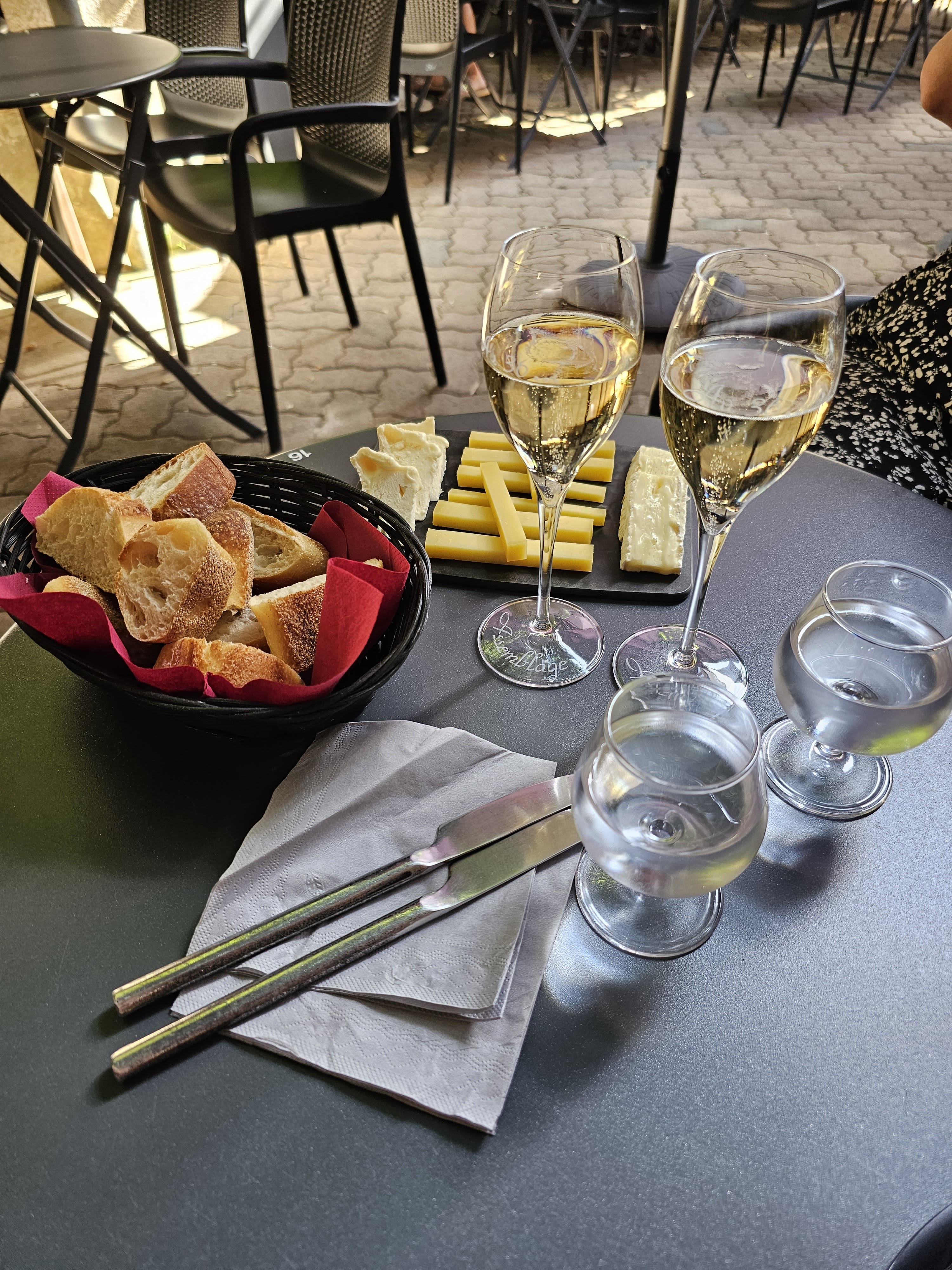 Délicieux champagne avec plateau de fromages. Jolie petite terrasse avec une ambiance sympa. La qualité des prix est excellente.