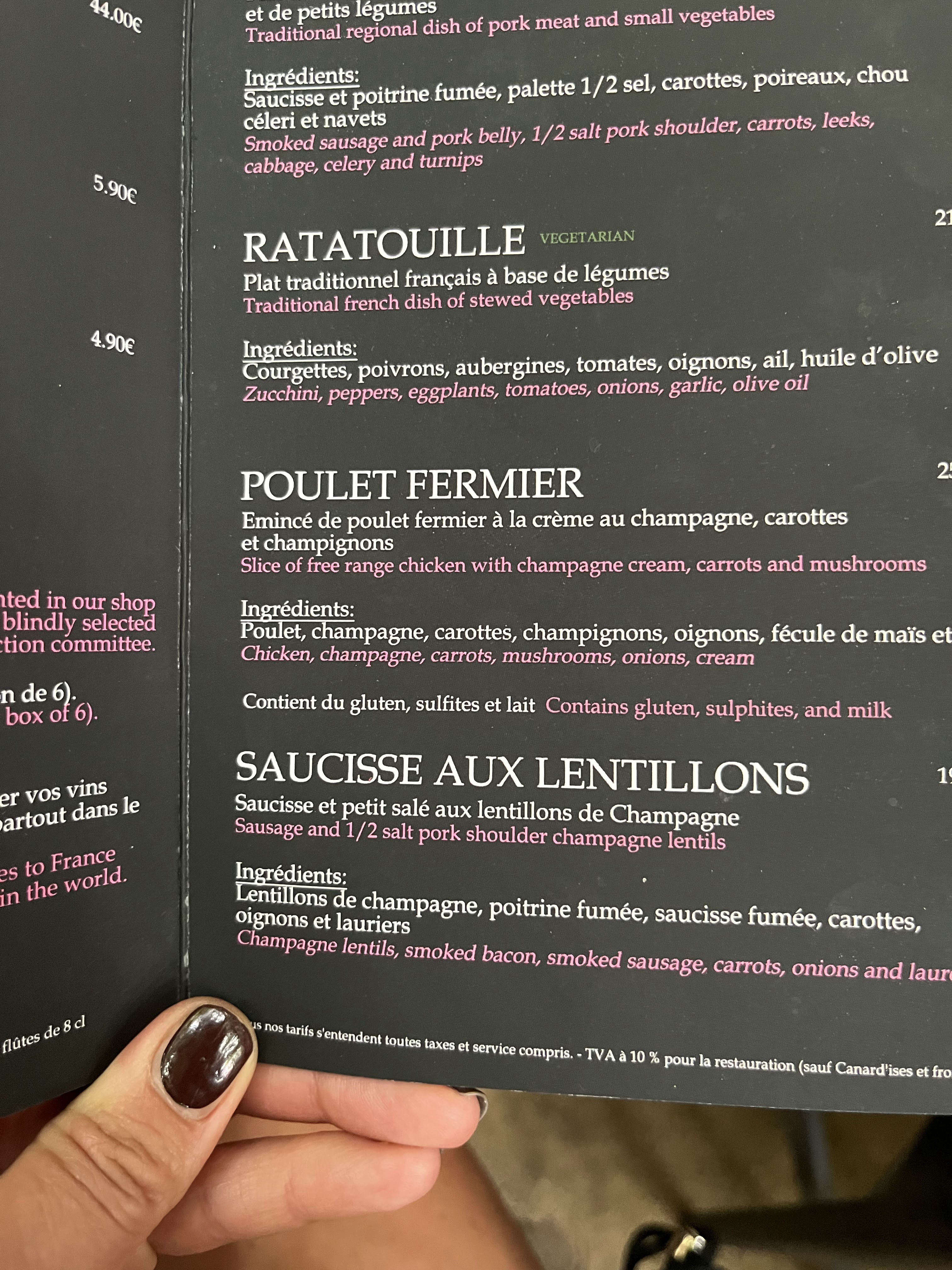 Carte de spécialités campagnardes et champagnardes. Pour manger un bon morceau de terroir, je recommande vivement.