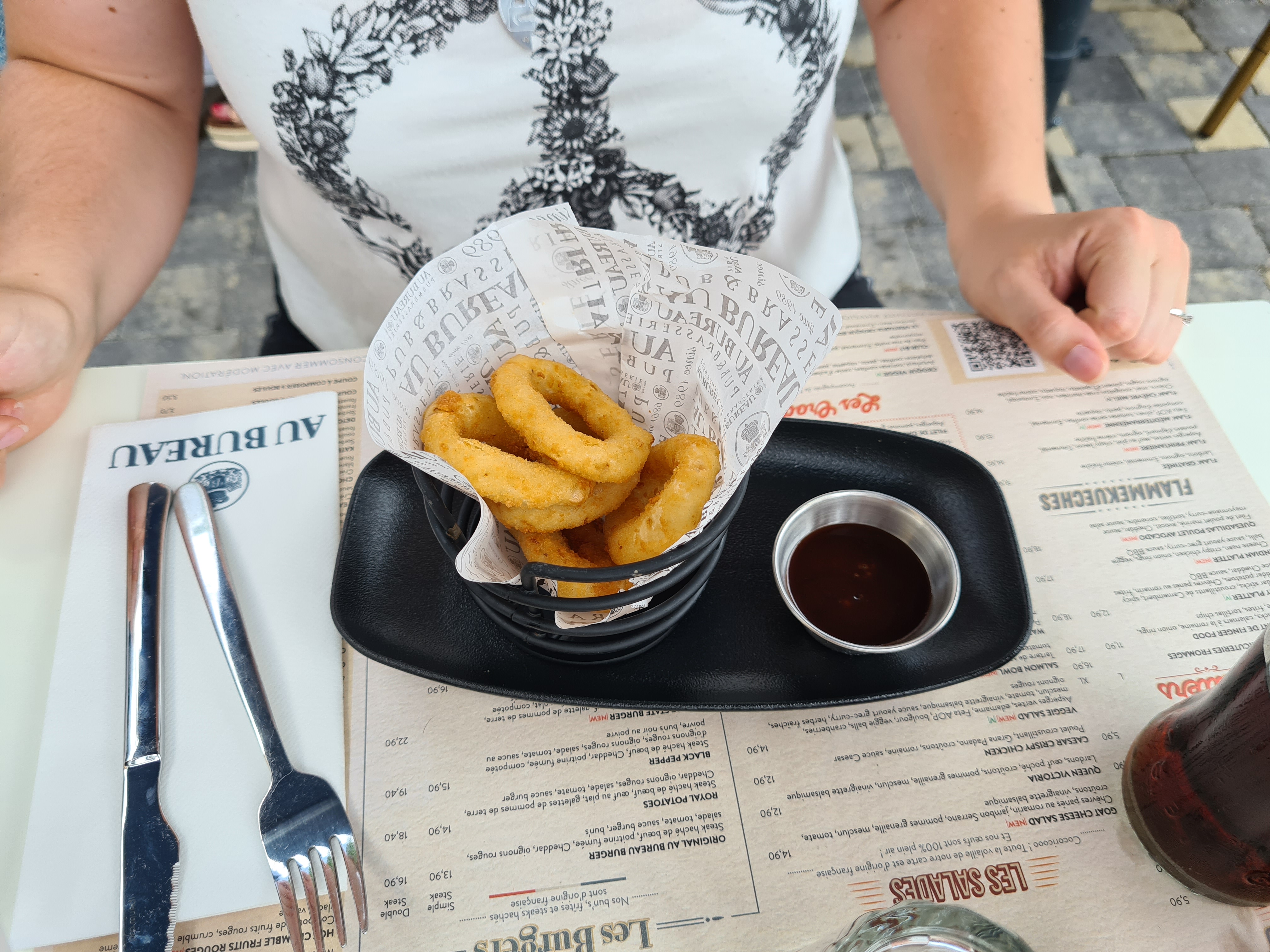 Sympa de pouvoir se poser en terrasse et boire un verre. Mais au niveau de la cuisine j’ai plusieurs choses à dire… Déjà payer 6,90€ pour 3 petits crispy chicken c’est de l’arnaque, beaucoup beaucoup trop cher et on sent qu’ils sont décongelés quoi … Ensuite, j’ai commandé le spicy burger, dans lequel il n’y avait absolument rien de spicy, un enfant de 5 ans aurait pu le manger sans problème. Donc pourquoi mettre spicy s’il ne pique pas un minimum ? (et pourtant je n’ai pas une énorme tolérance au piment mais quand même). De plus, à 18€ le burger je m’attends à un peu plus qu’un mini bout de salade et 3 pauvres oignons caramélisés (voir photo). Le steak, le pain et les frites étaient corrects mais le reste à revoir. Autant aller à mcdo les burgers sont meilleurs et moins chers ! Aussi, je peux comprendre les soucis d’effectifs vu la conjoncture actuelle, mais si les serveurs ne sont pas capables d’offrir un service qualitatif à l’ensemble des clients, ne vaudrait-il pas mieux fermer une partie de la terrasse ou à l’intérieur et réduire le nombre de tables à servir ? Ils n’étaient pas désagréables mais juste hyper débordés et c’était un service à la chaîne… Je reviendrai peut-être boire un verre mais certainement pas pour manger.