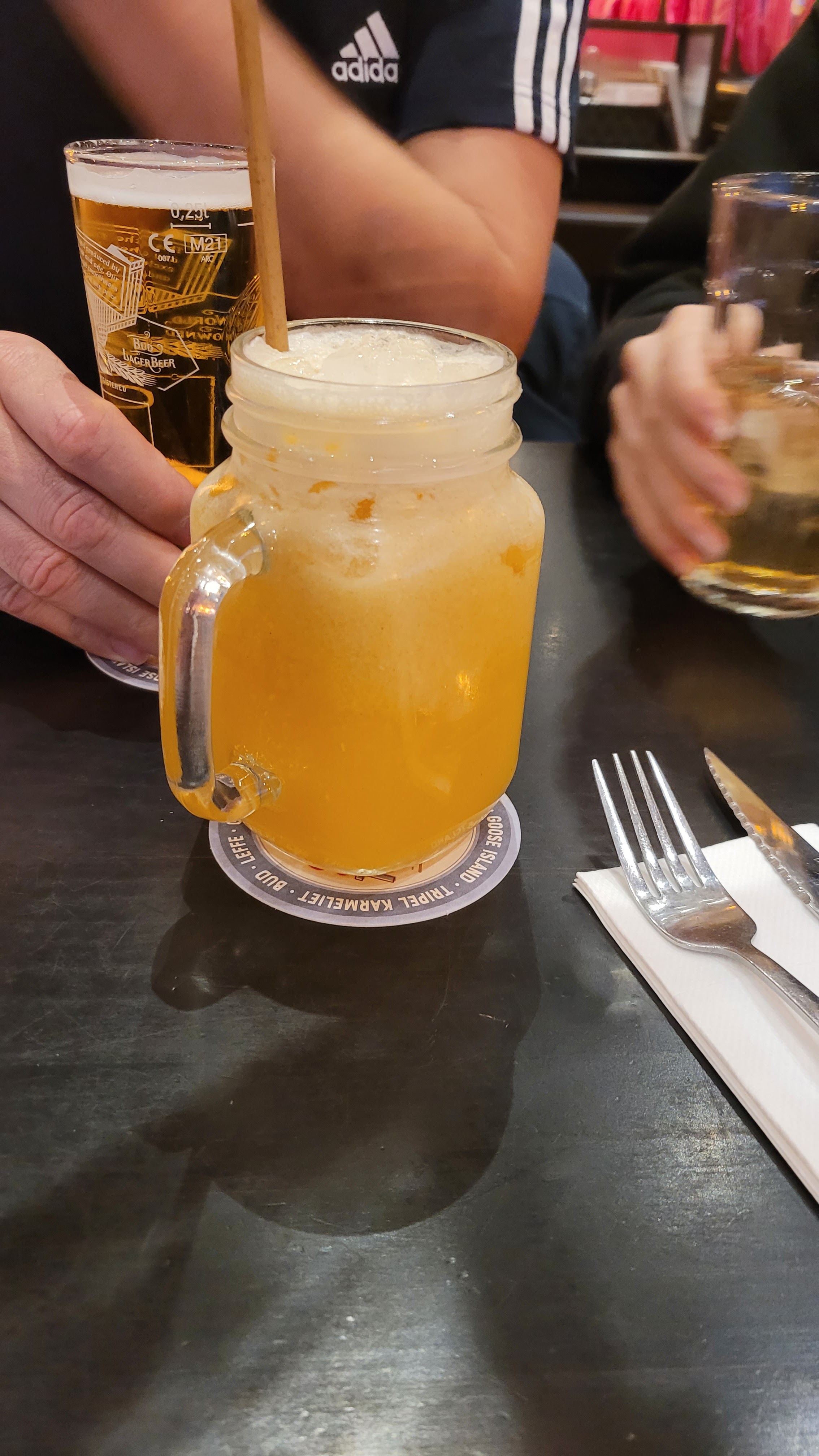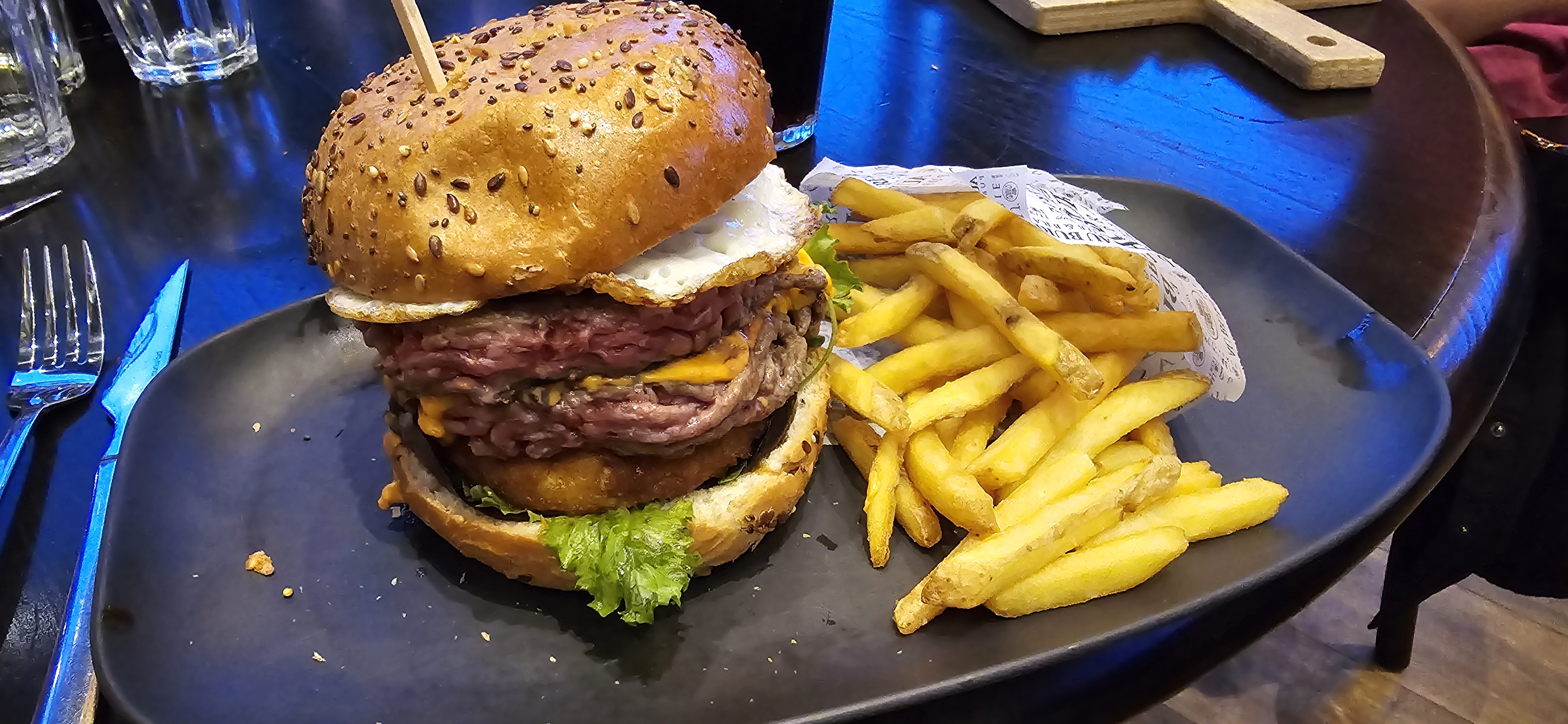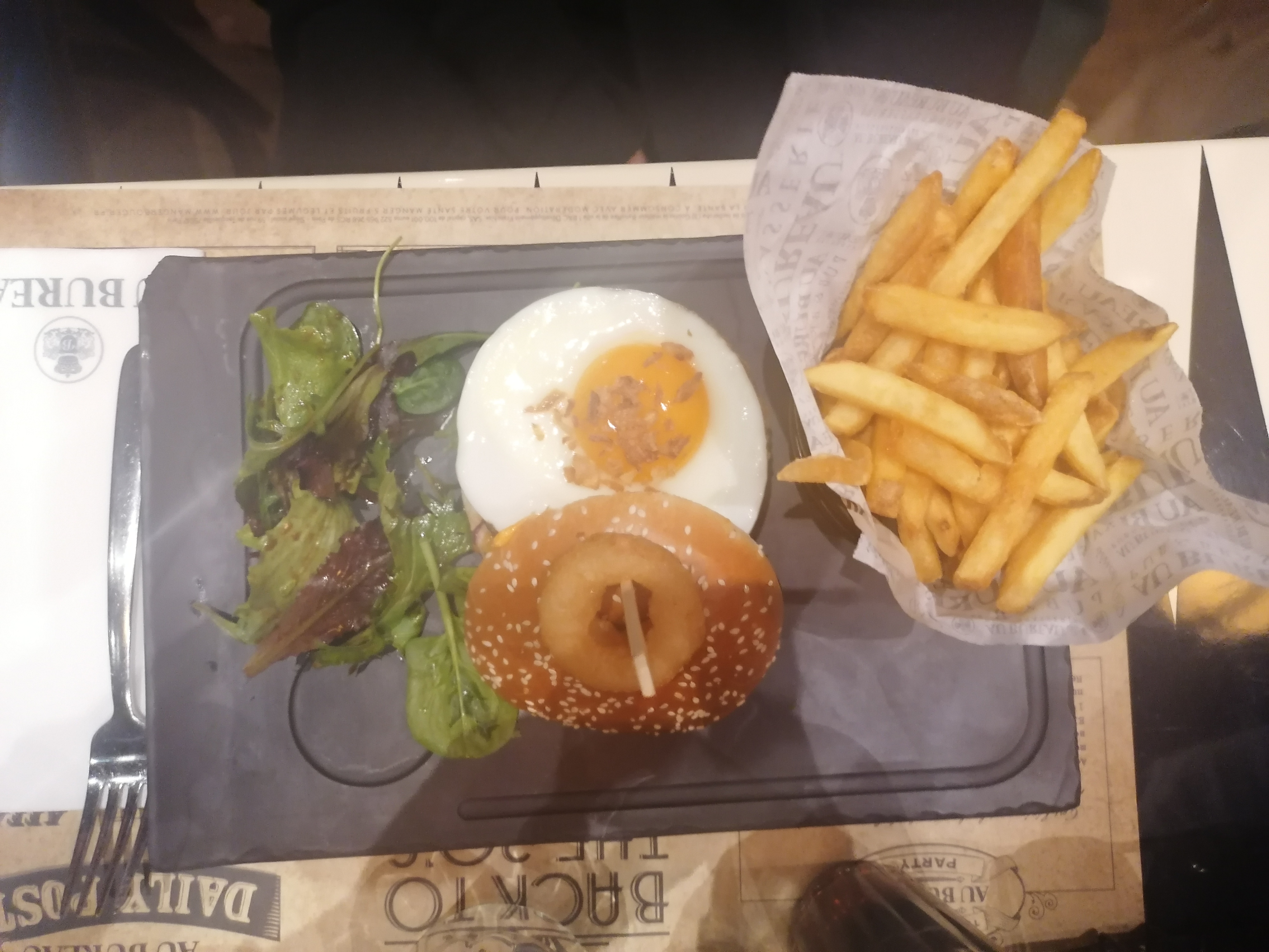Table de 10 personnes vendredi soir 19h, pour un anniversaire. On commande quelques burgers, ils sont pas oufs mais j'en attendais rien de spécial (buns congelé) mais servis avec des frites froides. On prend des desserts, ils sont servis à table sans couverts, on a appelé les serveurs à plusieurs reprises, on a l'impression qu'ils sont tellement dans le rush qu'ils font tout pour pas être alpagués et regardent constamment le sol durant le service.. bref on nous ramène nos cuillères 15min après. La commande spéciale anniversaire n'a pas été respectée et loupée dans le timing.. 19h à 21h45 pour un verre un plat et un dessert et c'est devenu très cher, 14,90EUR pour un bout de pain tartiné, 17,90EUR un burger au guacamole en tube, pain décongelé et frites froides.