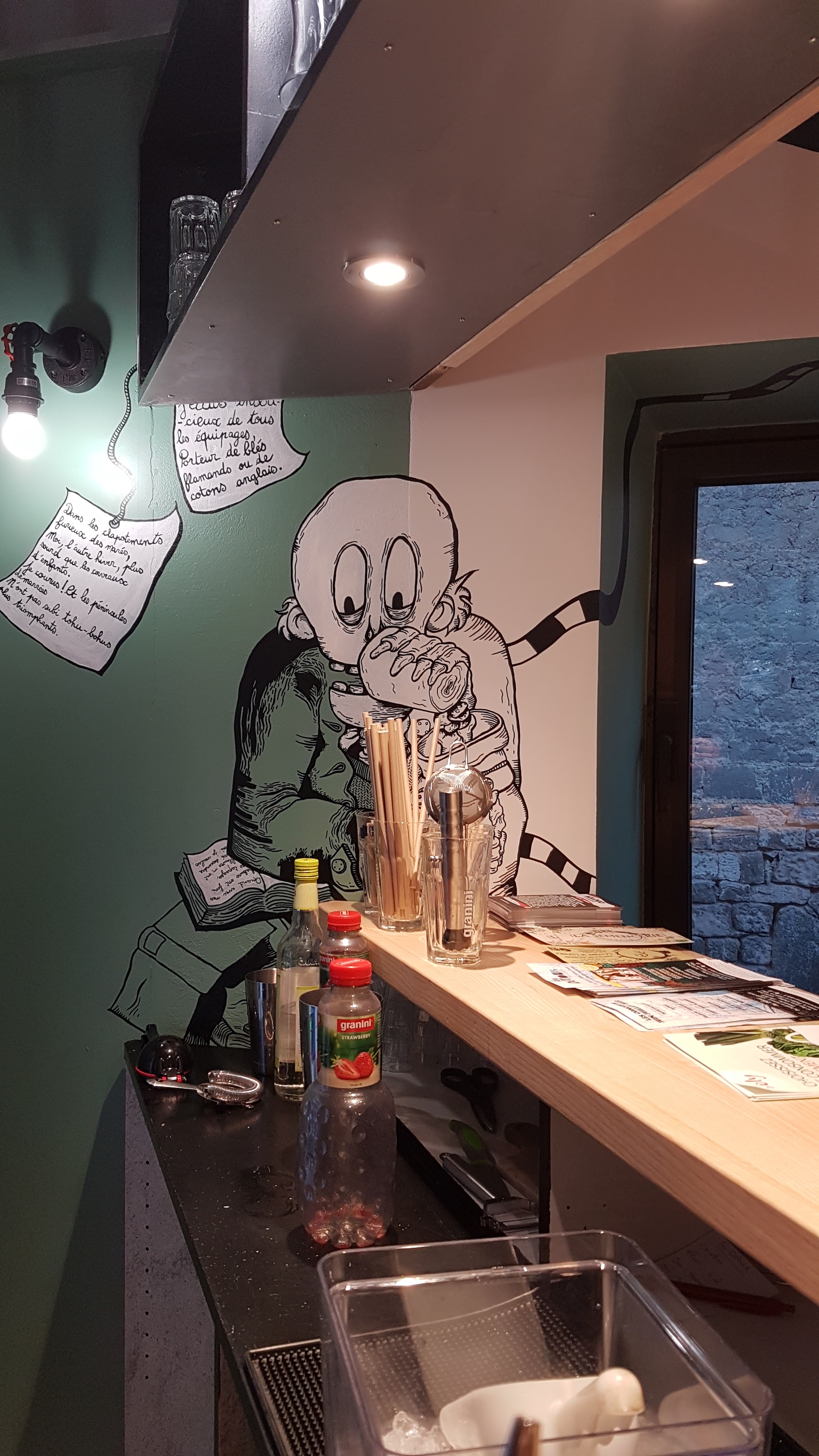 Ce bar porte bien son nom. On s'y est arrêté pour en suivant la rando du chat perché : une triple pour Mr et une limo+glace pour moi. Le serveur, poli, nous a servi avec un sourire bienveillant. Puis arrive Estelle Cermelli dont nous faisons connaissance, artiste qui devrait être renommée tant son talent est incroyable ! Que ce soit au crayon, au stylo, à l'aquarelle ou la peinture à l'huile, tout y passe et le thème, totalement d'actualité est criant de vérité. Courez faire un tour au bar Au détour quu est idéal pour y passer un petit moment ou même un événement à célébrer entre amis (n'hésitez plus et réservez la salle à l'étage) autour de quelques bières à partager un moment unique et sans pareil. Une partie de fléchettes peut être organisée et franchement les produits sont nombreux alors il faudra un moment avant d'en avoir fait le tour. Superbe découverte du jour alors que nous sommes de simple passage à Dole !