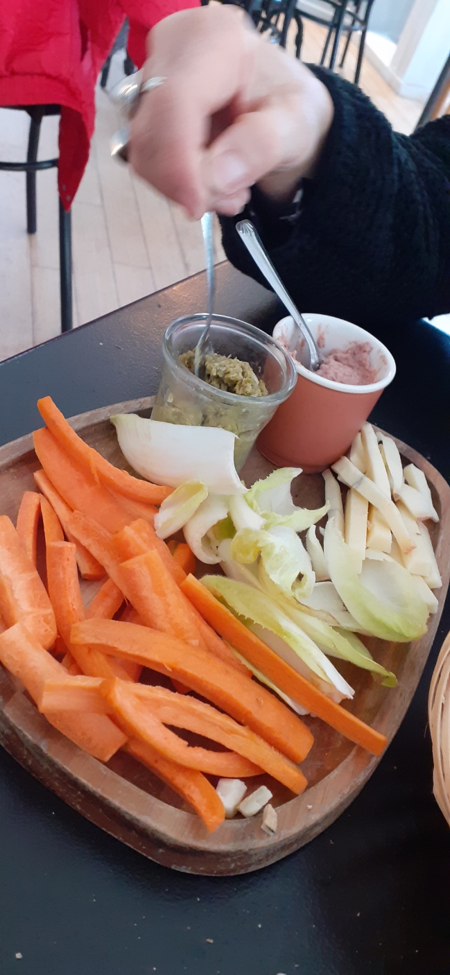 La Planche gourmande servie ce jour....pour 18 euros (quelques bâtonnets de carottes un peu sèches, 8 feuilles endives moyennement fraîches, 2 petits pots de houmous et tapenade, une pincée de batonnets de fromage) une honte tout simplement