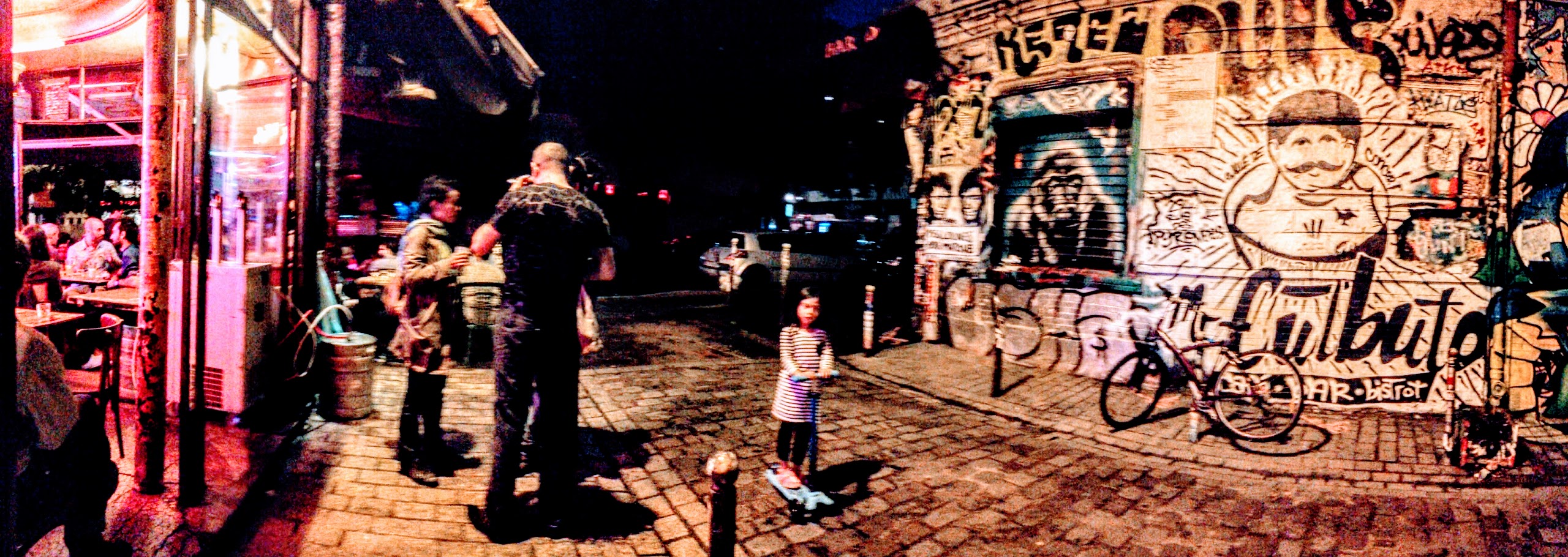 Vraiment un bon endroit pour prendre un verre surtout en été quand il fait chaud. Si vous attendez quelque chose de haut de gamme et haut de gamme, ce n'est pas pour vous. Cependant, si vous voulez quelque chose de très détendu et détendu avec une ambiance communautaire, assurez-vous d'y aller. Les tables sont disposées dans une rue pleine de graffitis – ce qui lui donne beaucoup de cachet.
