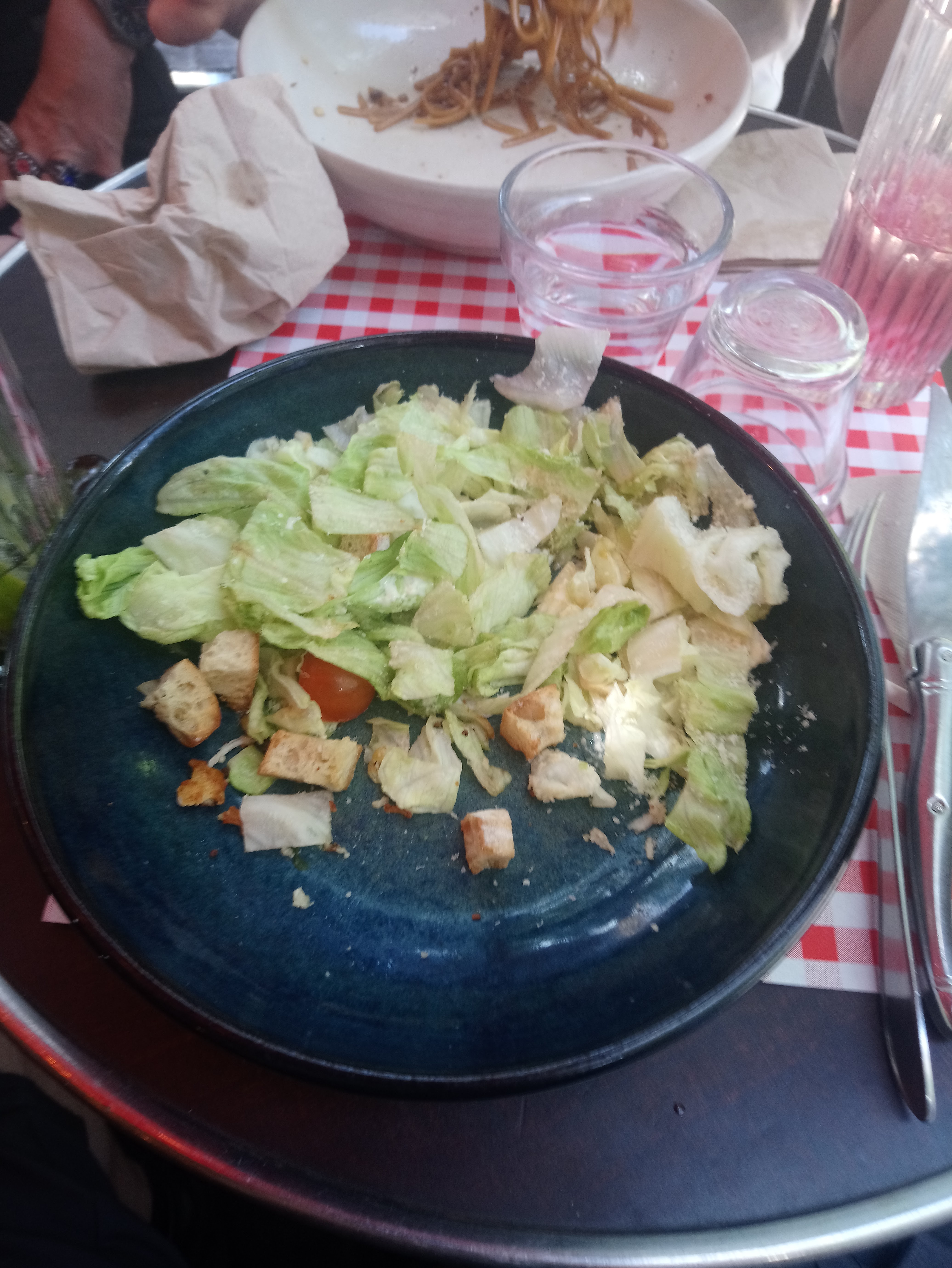 Chaises pas très confortables, il y avait des guêpes, terrasse presque dans le passage, pas très envie de rester longtemps