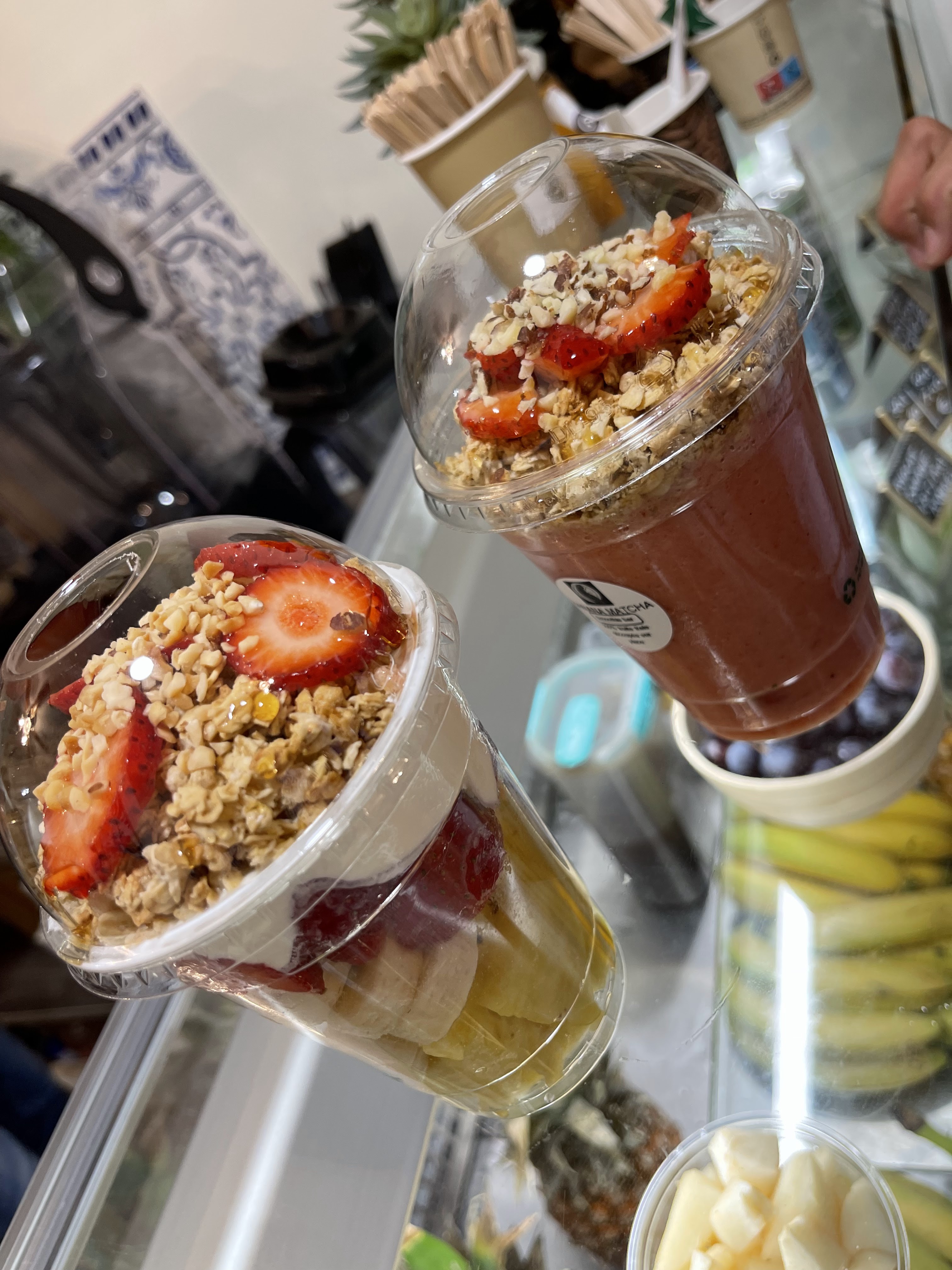 Super smoothie minute avec des bons fruits frais Le smoothie avocat banane et lait d'amande est délicieux Le matcha glacé est très bon et équilibré