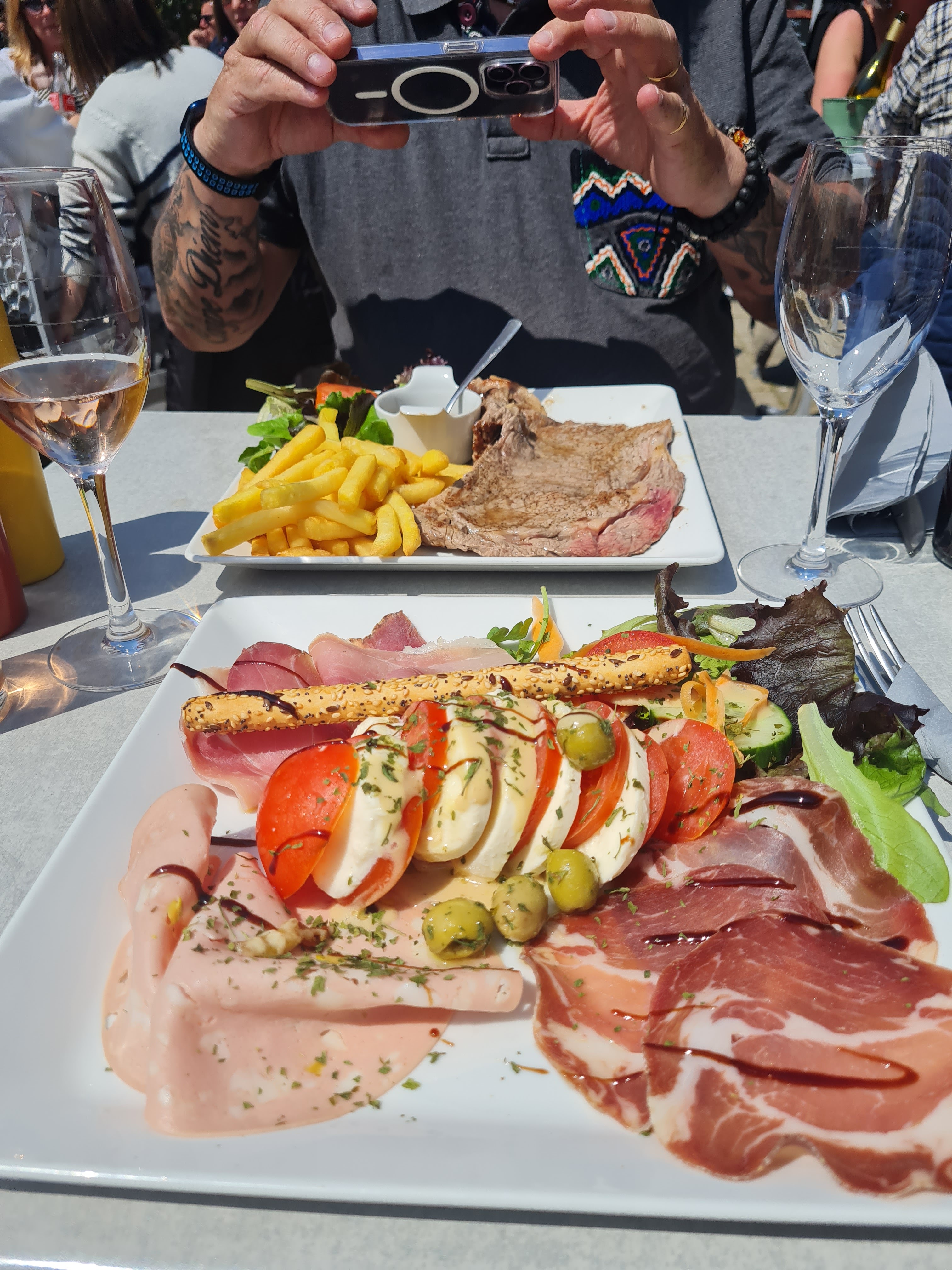 De passage nous sommes arrêté pour prendre l apéro , et du coup on est resté mangé au soleil , le serveur super sympa , et la salade italienne super bonne , entrecôte raffiné . Par contre j ai demandé des frites en plus j ai trouvé un peut cher la part , 4 euros 50 . Mais c est pas grave quand tu est en vacances.