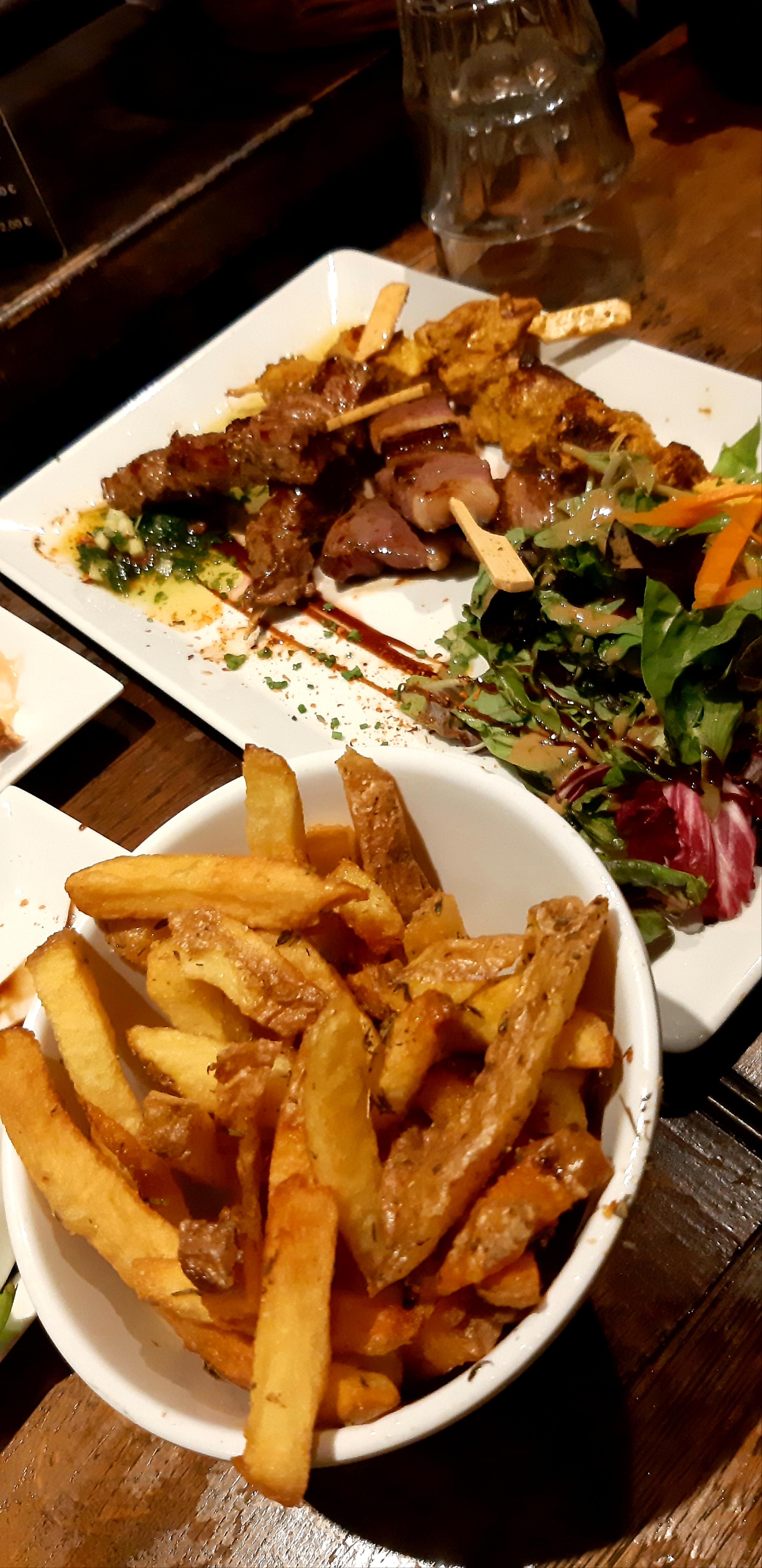 Prix du repas assez élevé pour le contenu. Les tapas selon appréciation du chef... Nous nous sommes retrouvé avec en parti 4 tomates cerise, 4 bâtonnets de concombre, 8 bâtonnets de carotte, 4 radis, et d'autres trucs... Et cela pour 4 personnes... Les brochettes sont correctes mais manque un peu de quantité et pour le dessert la moelleux au chocolat fait la taille d'une pièce de 2 euros 😂. Bref je n'y retournerai pas.