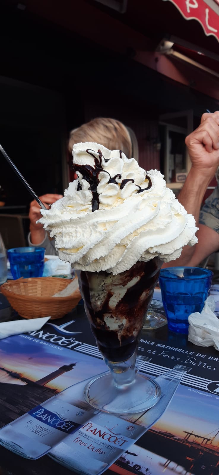 Des huîtres et des crevettes excellentes, des moules charnues et goûtues servies avec de succulentes frites, le tout suivi par le dessert-de-la-mort-qui-tue, à savoir la douceur bretonne ( glaces chocolat, vanille, caramel surmontées d'une montagne de crème fouettée). La promenade qui a suivi fut digestive... Merci pour votre accueil si sympathique !