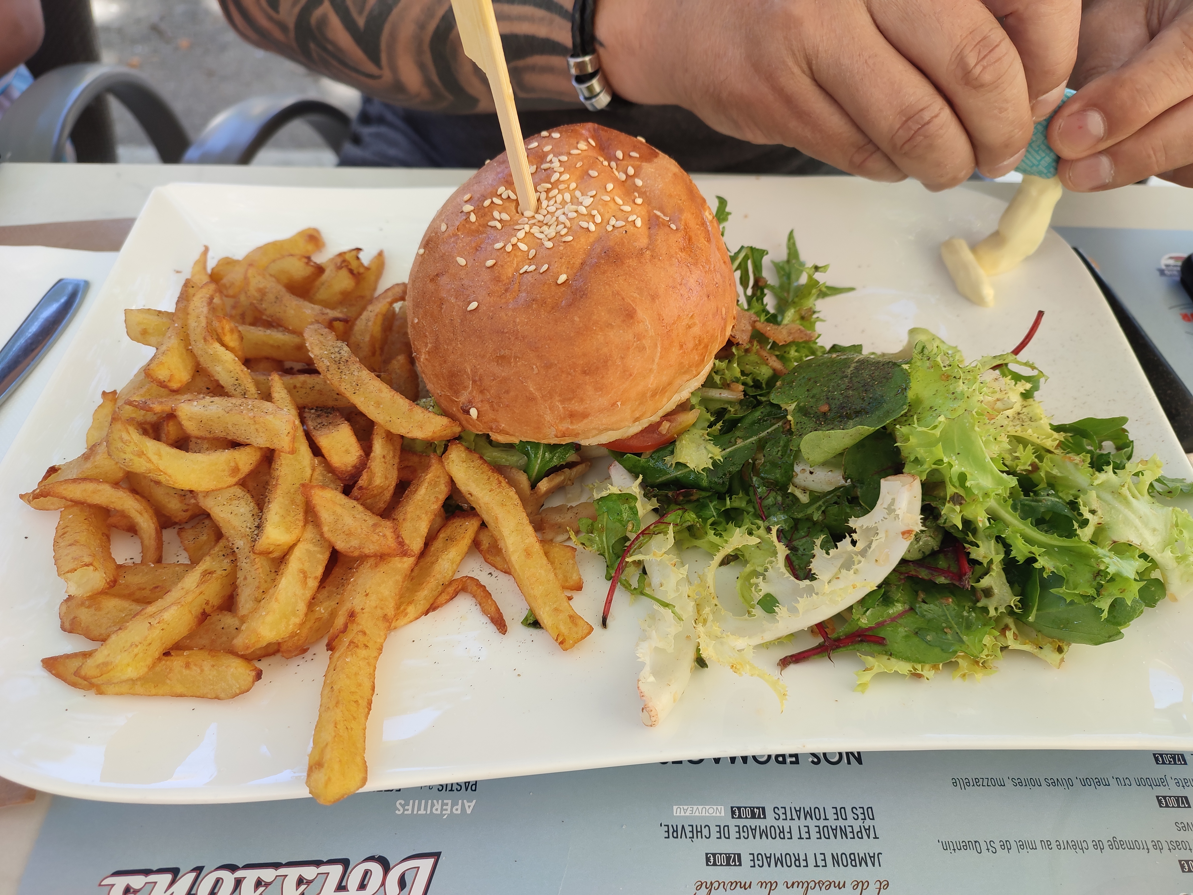 Délicieux menu du jour du midi et un burger camarguais Très satisfait du service fluide.