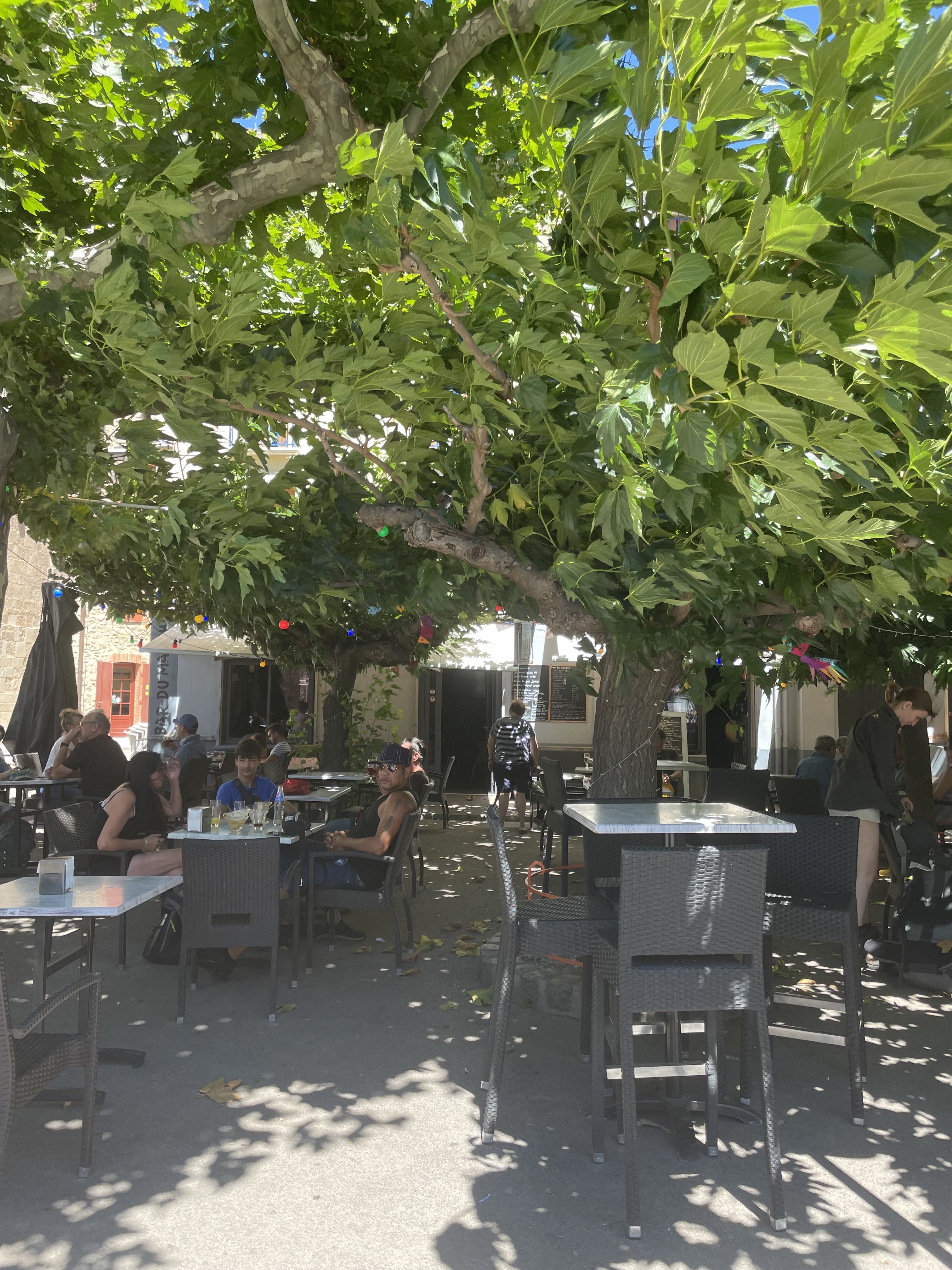 Sur la terrasse à l'ombre des mûriers pour prendre un verre après avoir fait les courses. Lieu incontournable lorsque nous allons à Prades.