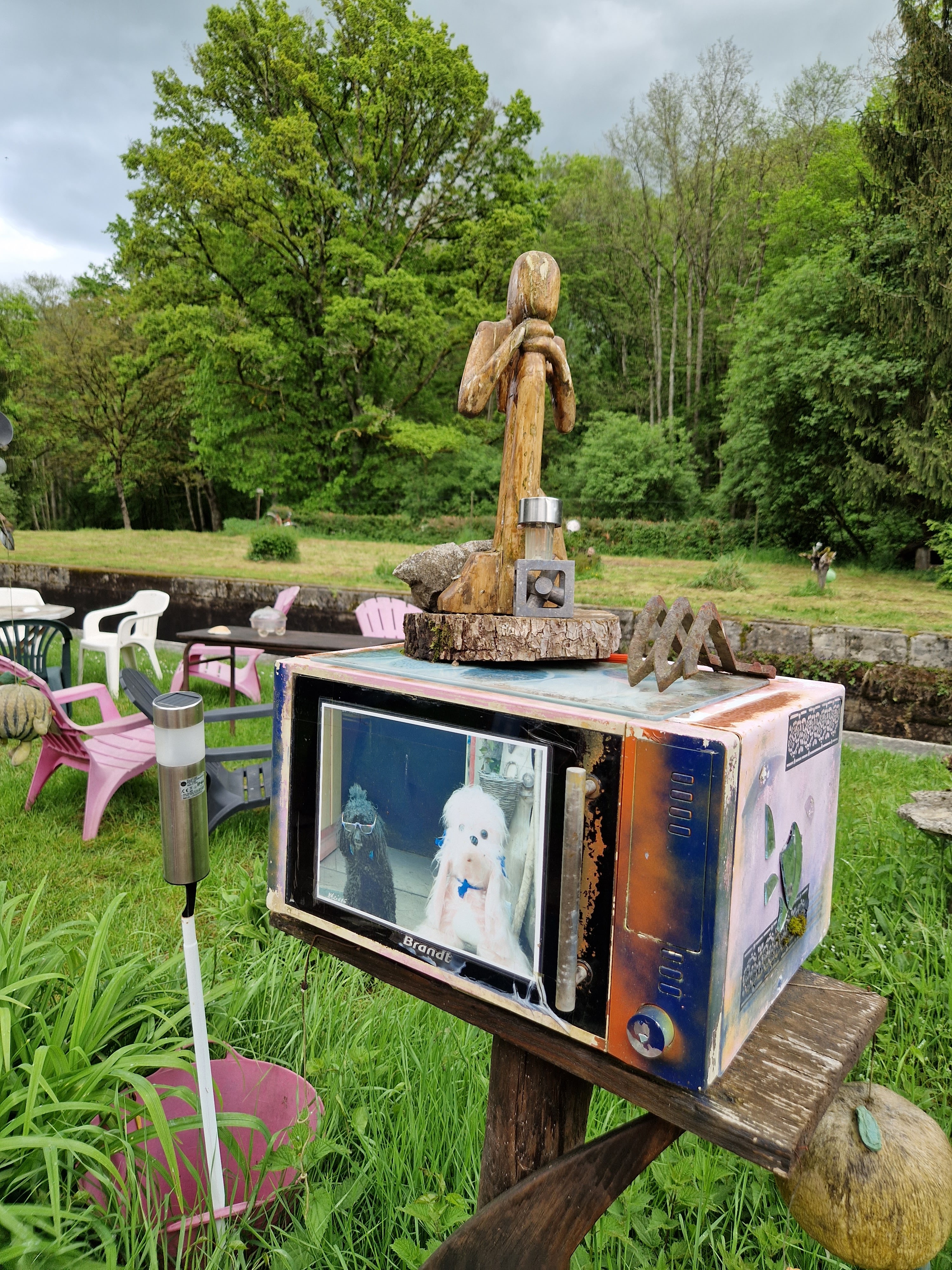 La plupart des écluses du canal du Nivernais sont rapprochées. Dans ce bar hippie, vous pouvez prendre une vieille chaise de jardin et vous détendre en regardant les bateaux. Oh oui, il y a un crâne d'éléphant à l'intérieur. Assez gros