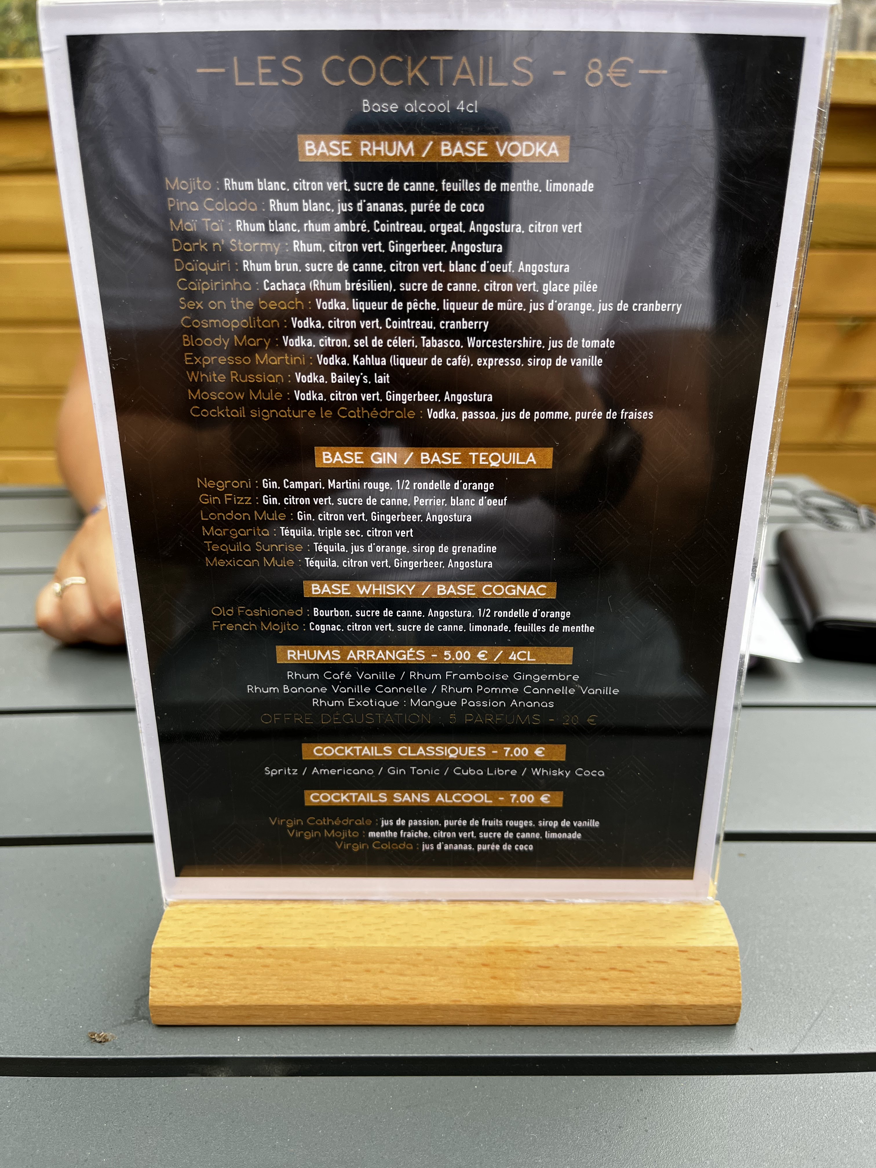 Personnel très accueillant et sympathique😊 Grand choix de cocktails À souligner l'originalité du plafond qui fait de l'ensemble un cadre très agréable pour boire un verre au pied des remparts! L'assiette de tapenade maison est un réel plus car on sent les produits de qualité tout comme le pain qui est un régal Enfin autre originalité à souligner la bière qui s'appelle La Cathédrale pour rendre hommage à ce site, brassée par Anostoke, elle est vraiment très bonne et n'a rien à lui envier! En résumé, je recommande 😉