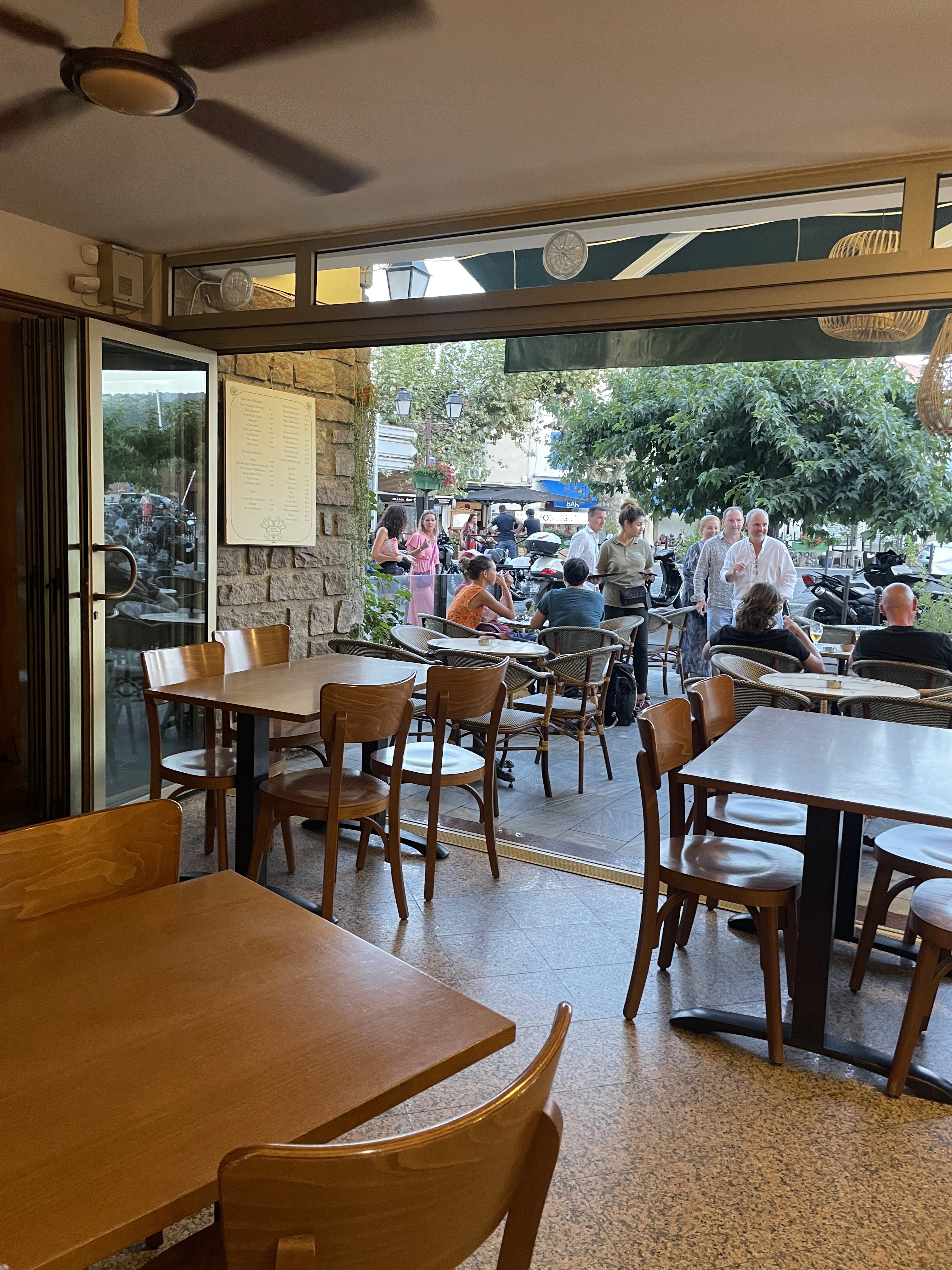 Bar central sur la place avec une exposition idéale de la terrasse au soleil et très animée Les serveurs sont adorables et les prix sont très corrects (comparativement à certains bars pas très loin..) 👍 pour les cacahuètes avec une bonne pression pietra bien fraîche : on adore 👌🏽
