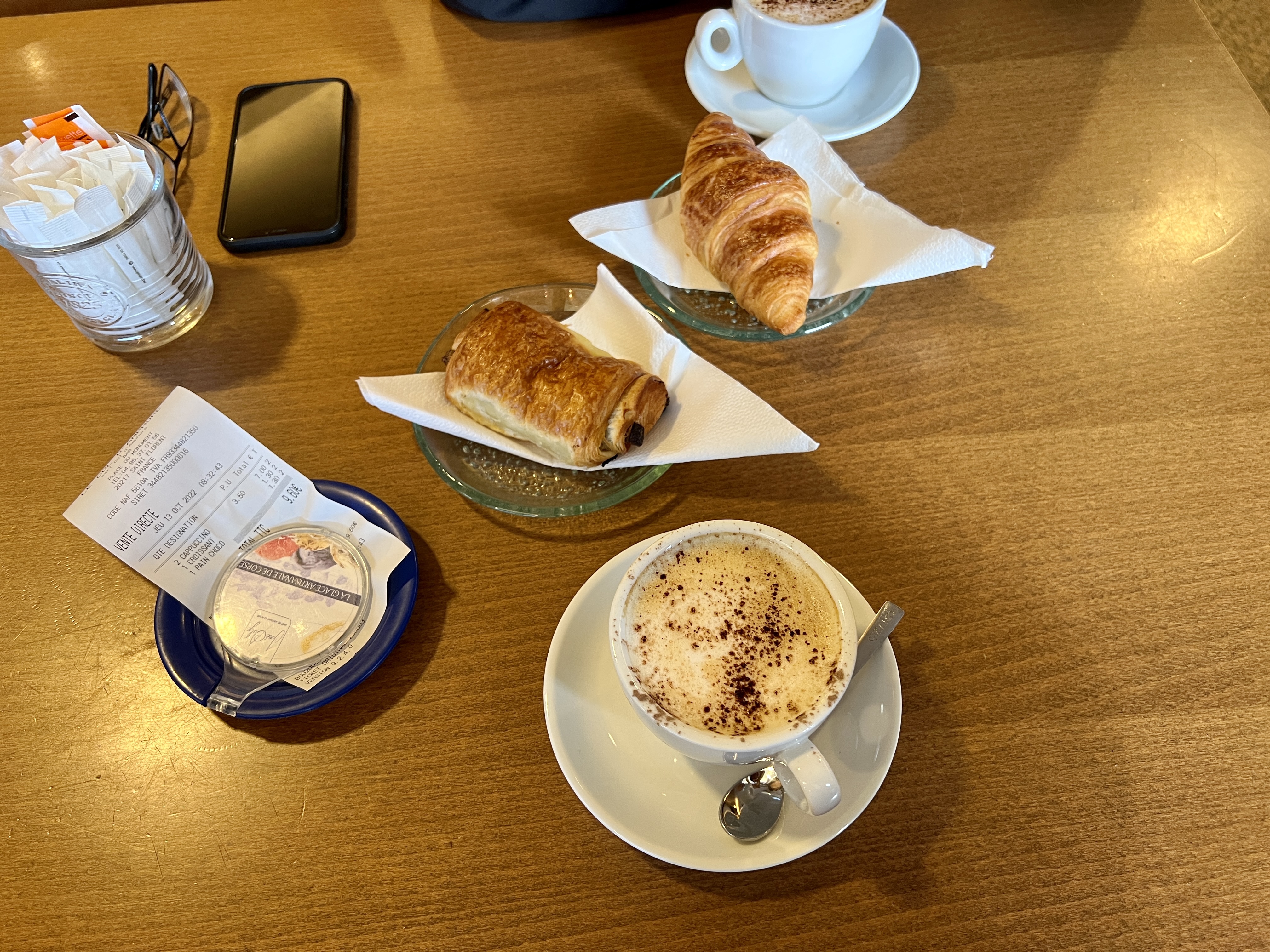 Pris le petit déjeuner. 8 euros pour le café, le croissant, la baguette de supermarché et le jus d'orange. Trop cher.