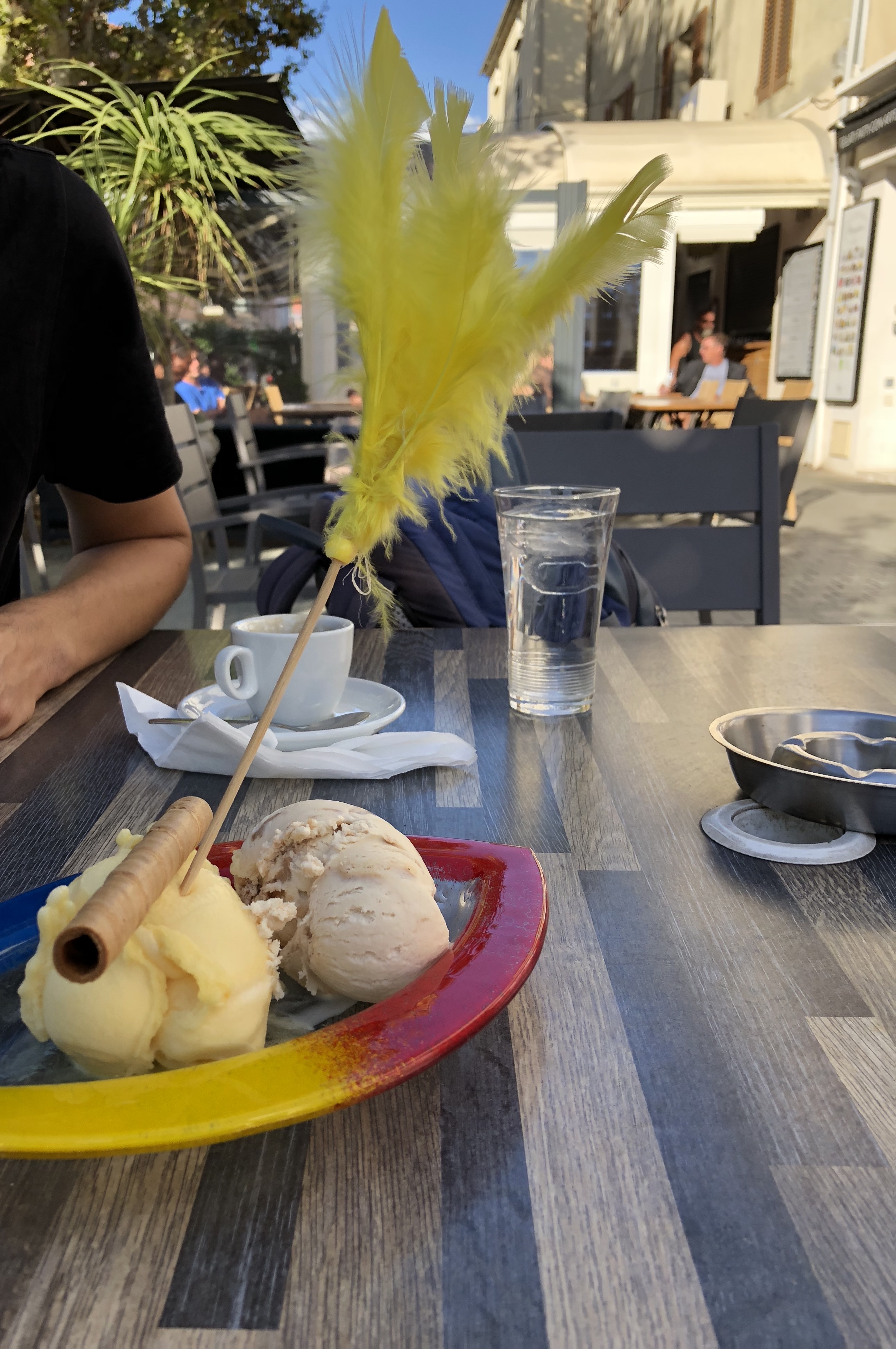 Deux boules de glace pour cinq euros, c'est un peu cher. On aurait pu se passer de l'assiette des années 90 et du boa à plumes. Le café était délicieux.