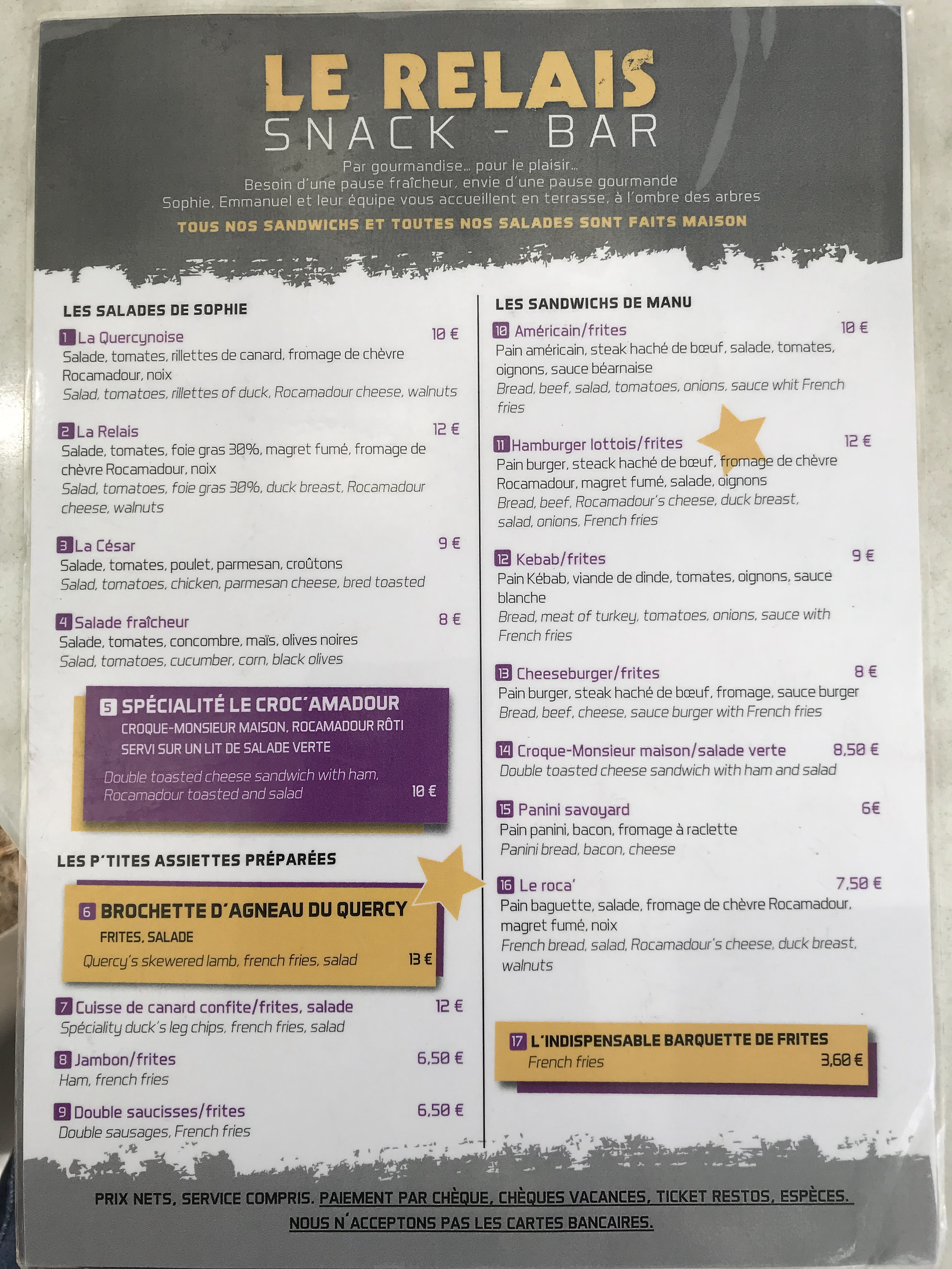 Acceuil sympa mais paiement uniquement chèque, espèce et ticket restaurant... A l'époque où le paiement via smartphone commence à se répandre, ici on est figé dans l'esprit du faire du black! Obligé courrir au distributeur....