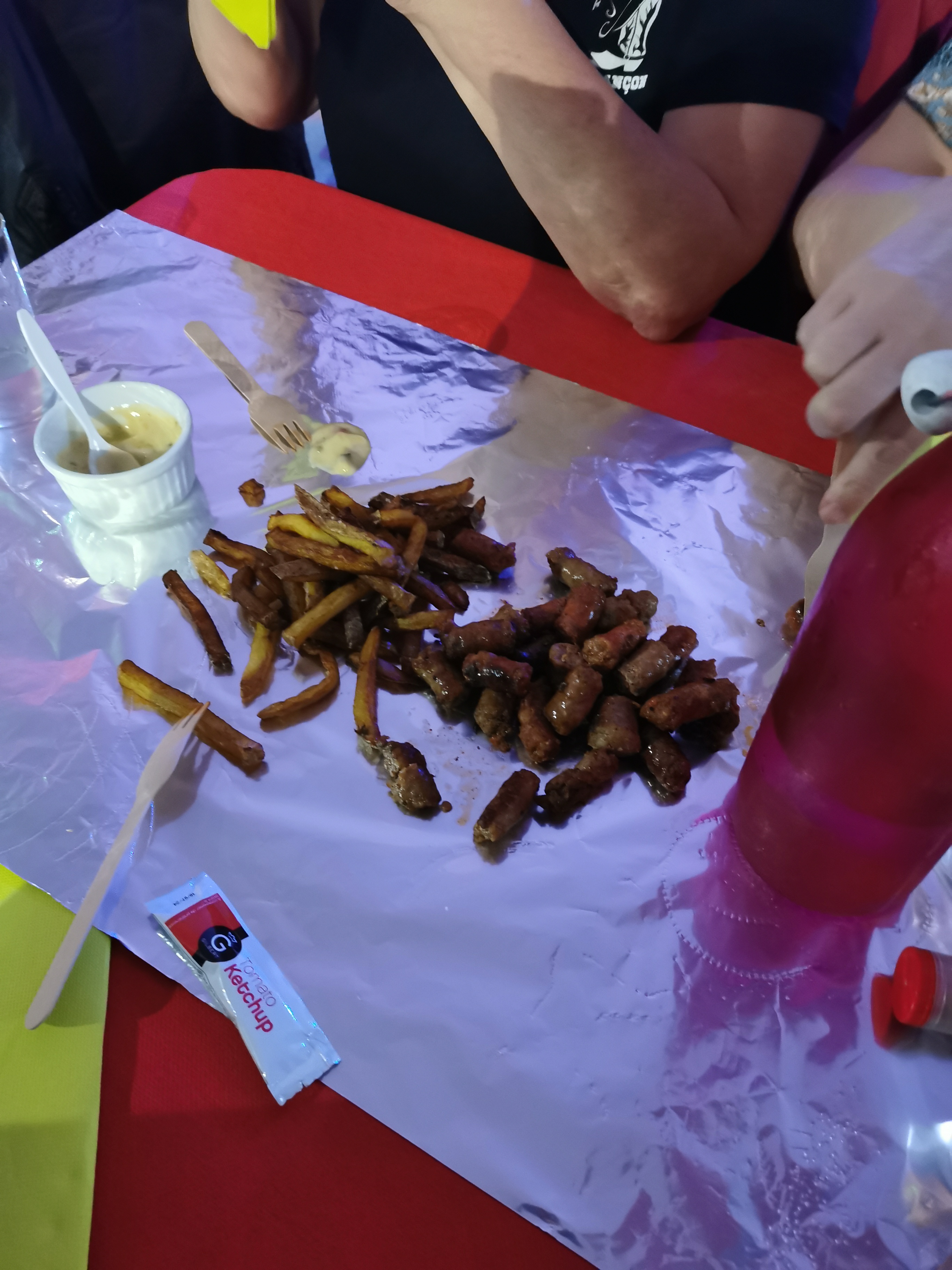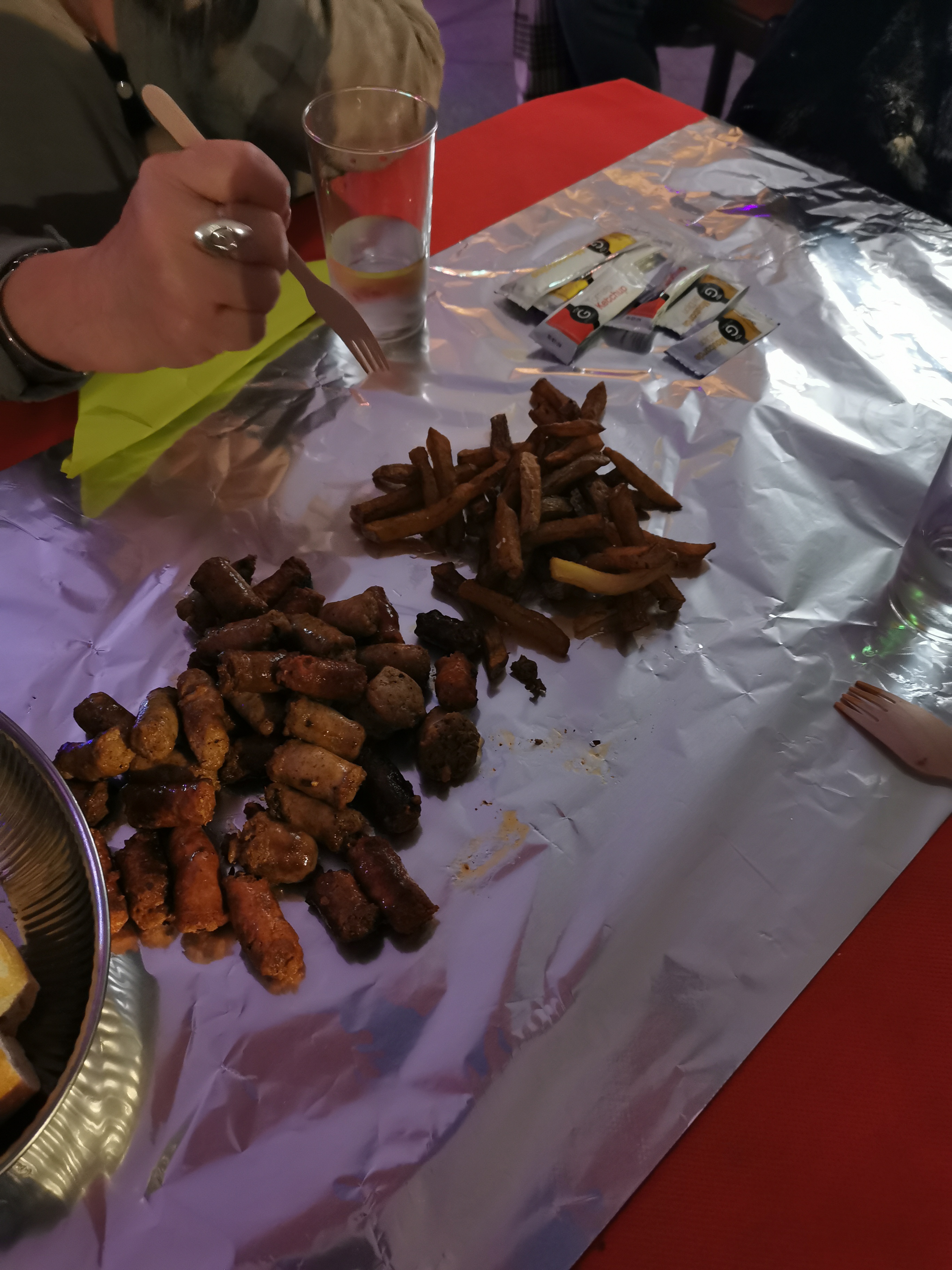 La photo parle d elle même, soirée tapas : bouts de saucisses et de merguez avec des frites, le tout servi à la main et posé sur du papier aluminium qui se trouvait au centre de la table ! Le tout 10 euros.