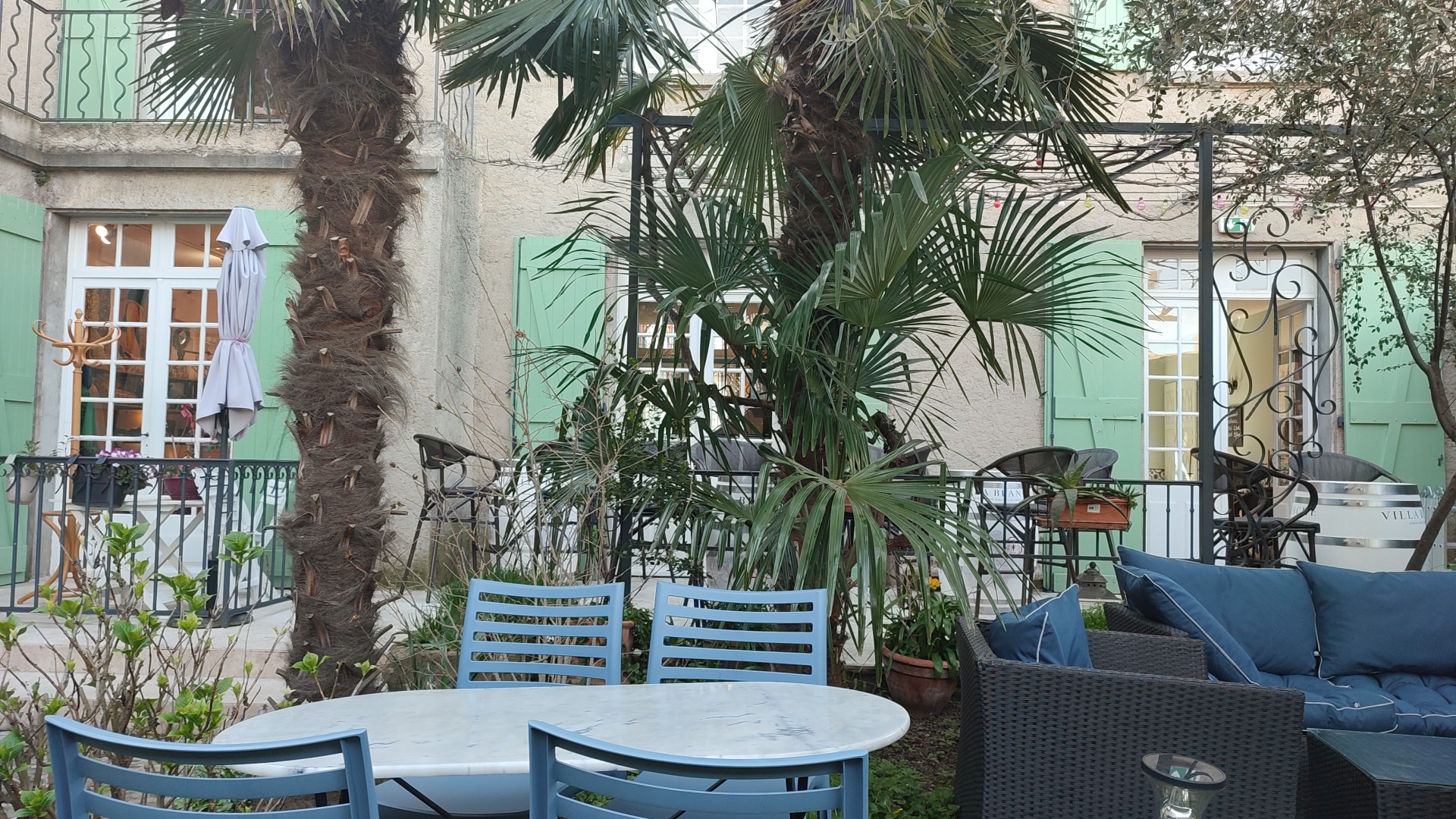 Une terasse ombragée paradisiaque.. un petit cloitre, havre de paix dans la citée. Je recommande vivement