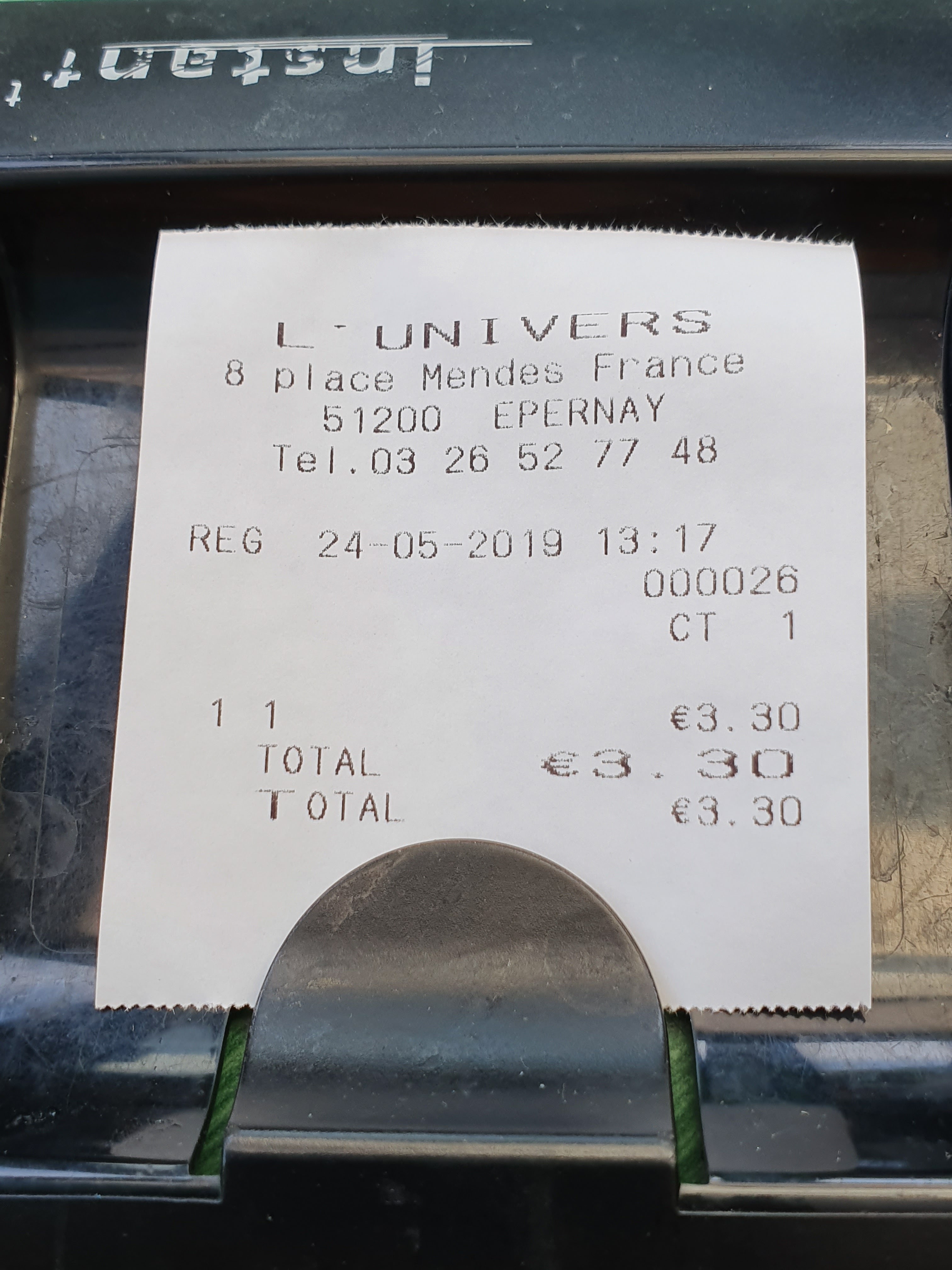 Probablement plutôt cher. 3,30 euros pour une tasse de café à Epernay. Le reçu indique le prix et non l'article.