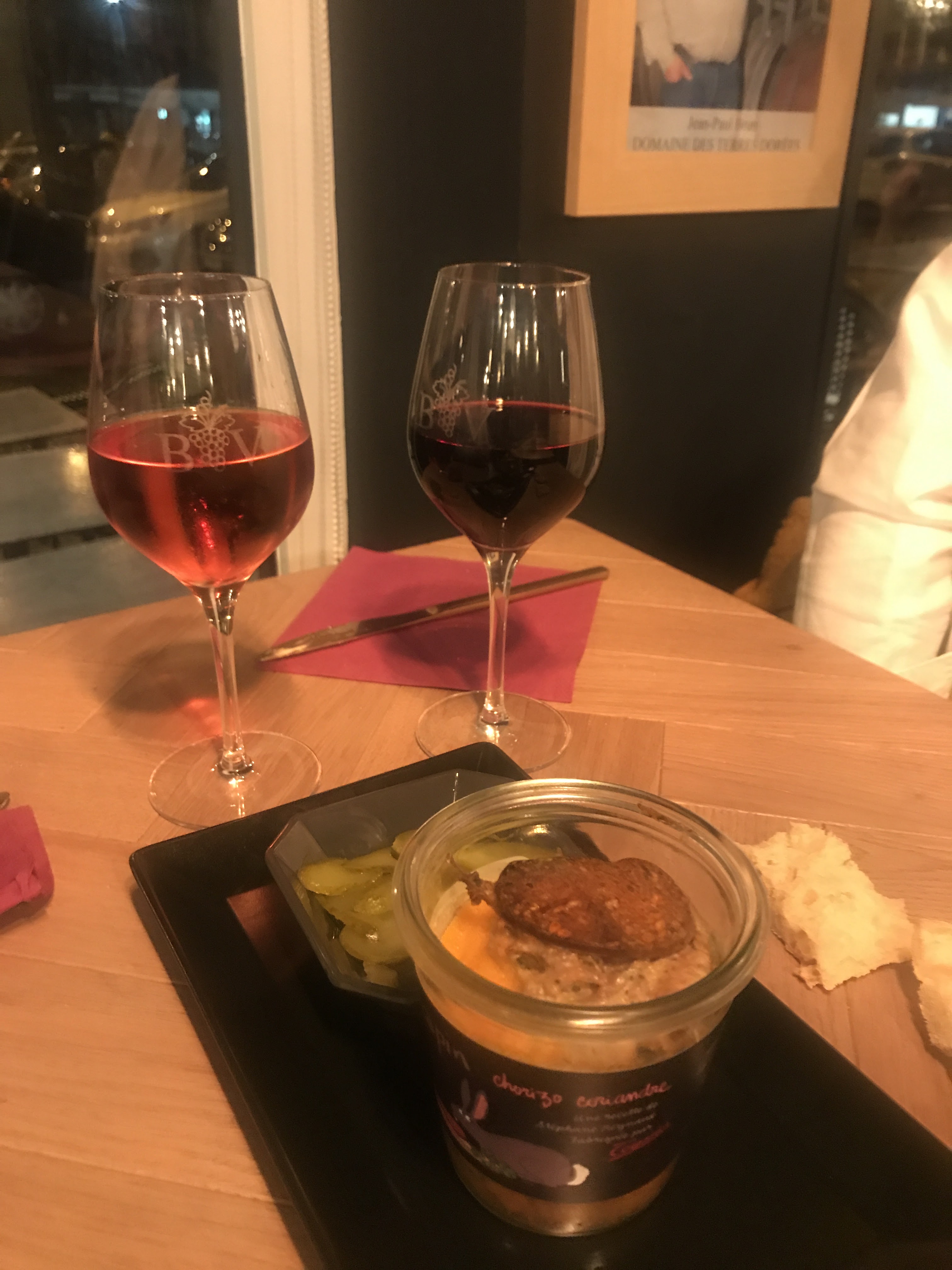 Très joli Viognier du Languedoc. Superbe planche « mini mix » de fromage, de viande et de pain. La musique à l’intérieur était bien meilleure que celle du dernier bar à vin où je suis allé dans cette charmante ville, qui était une poubelle répugnante. Mais comme l’environnement audio est important pour moi, j’aurais préféré entendre des chansons classiques pour accompagner la nourriture et le vin classiques. [Edit : Par « classique », j'entends la pop/jazz classique, etc., pas classique, comme Beethoven. J'ai été musicien toute ma vie et j'aime la mélodie, l'harmonie, les bonnes paroles, etc.]