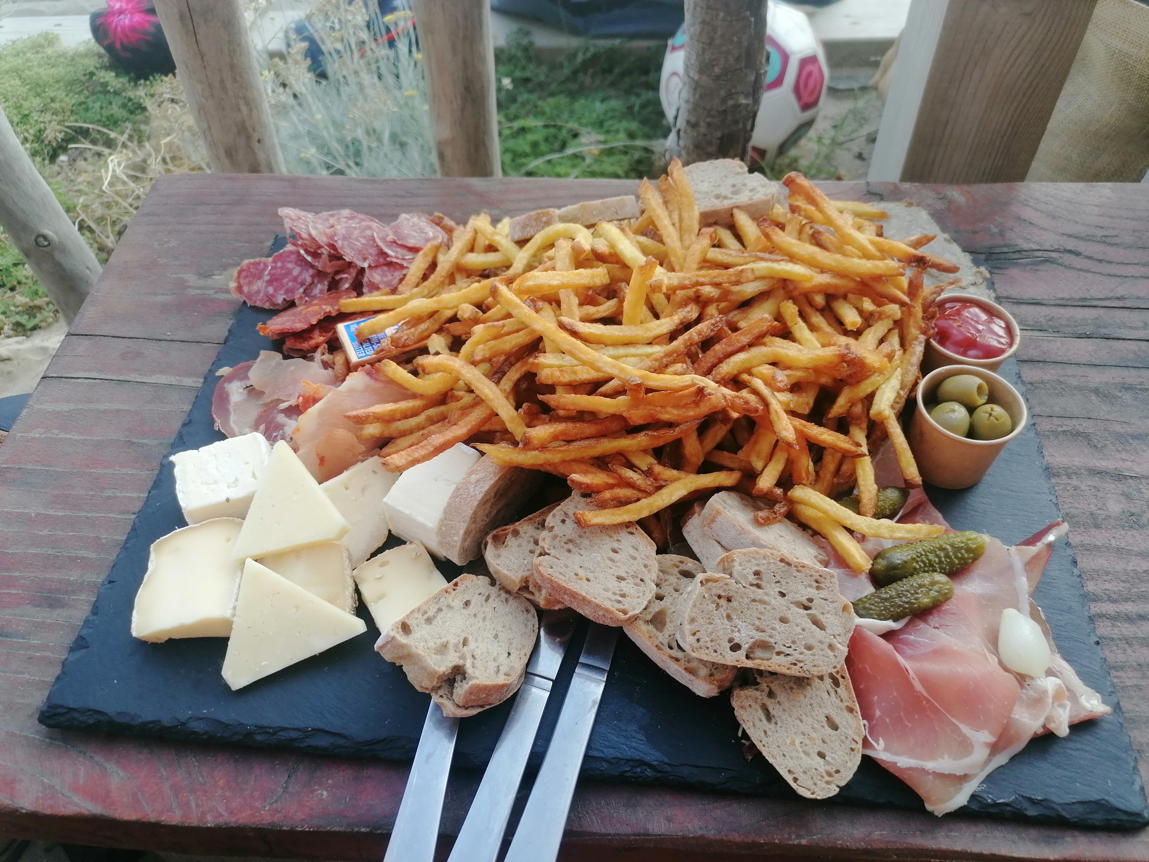 Recommandée par le proprio du camping la plage. Assiette fromage charcuterie pr une personne, super bien servi, des frites délicieuses. Personnel et service impeccable. Les pieds dans le sable, plage tranquille,magnifique 👍je recommande a 200%