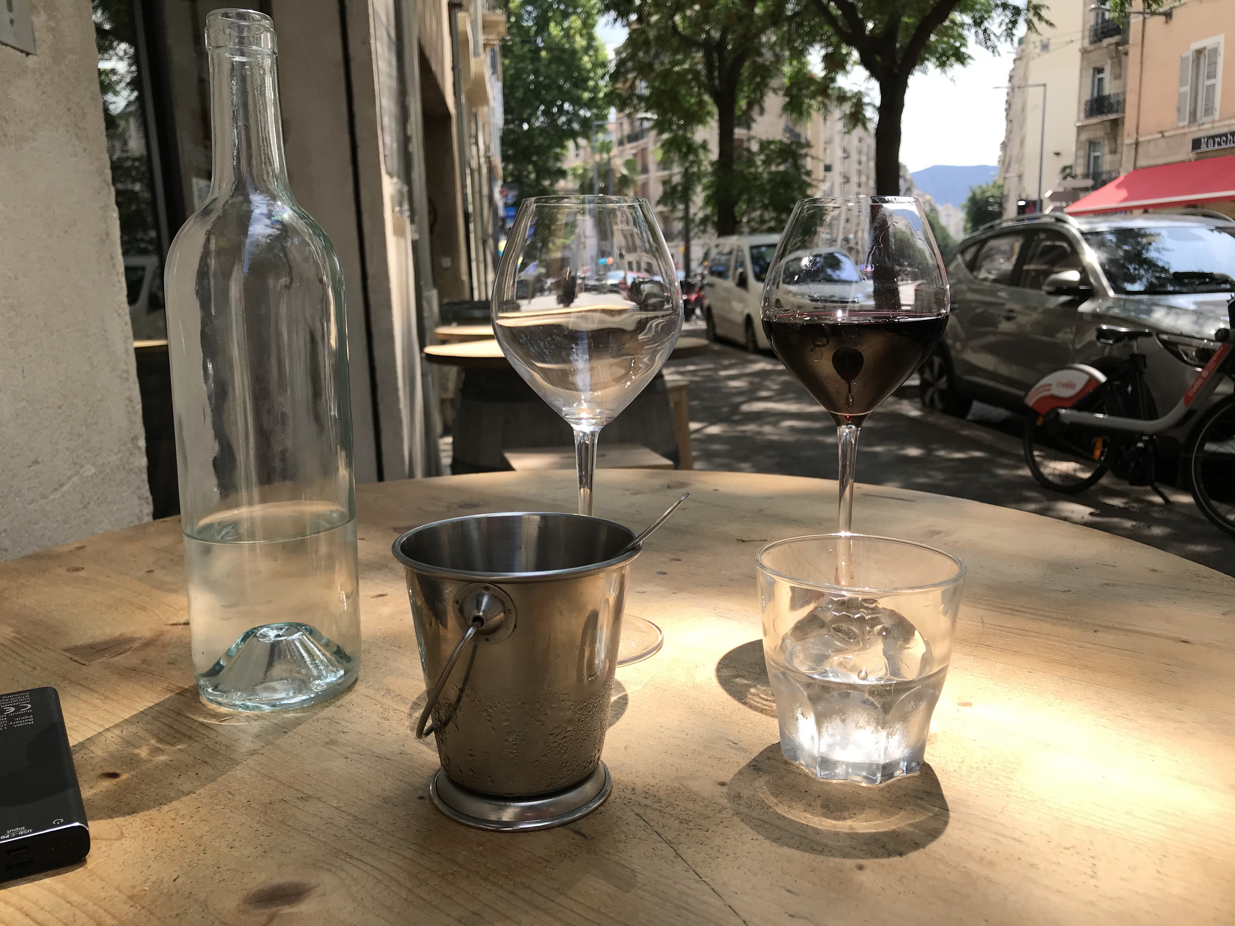 Très bonne ambiance ici. Asseyez-vous en plein air et dégustez deux verres de vin sous le soleil et la brise du sud de la France. Un blanc et un rouge. Le blanc est servi frais pour désaltérer. Le rouge est fruité, je pense qu'il contient des petits fruits ! Après-midi détendu et confortable!