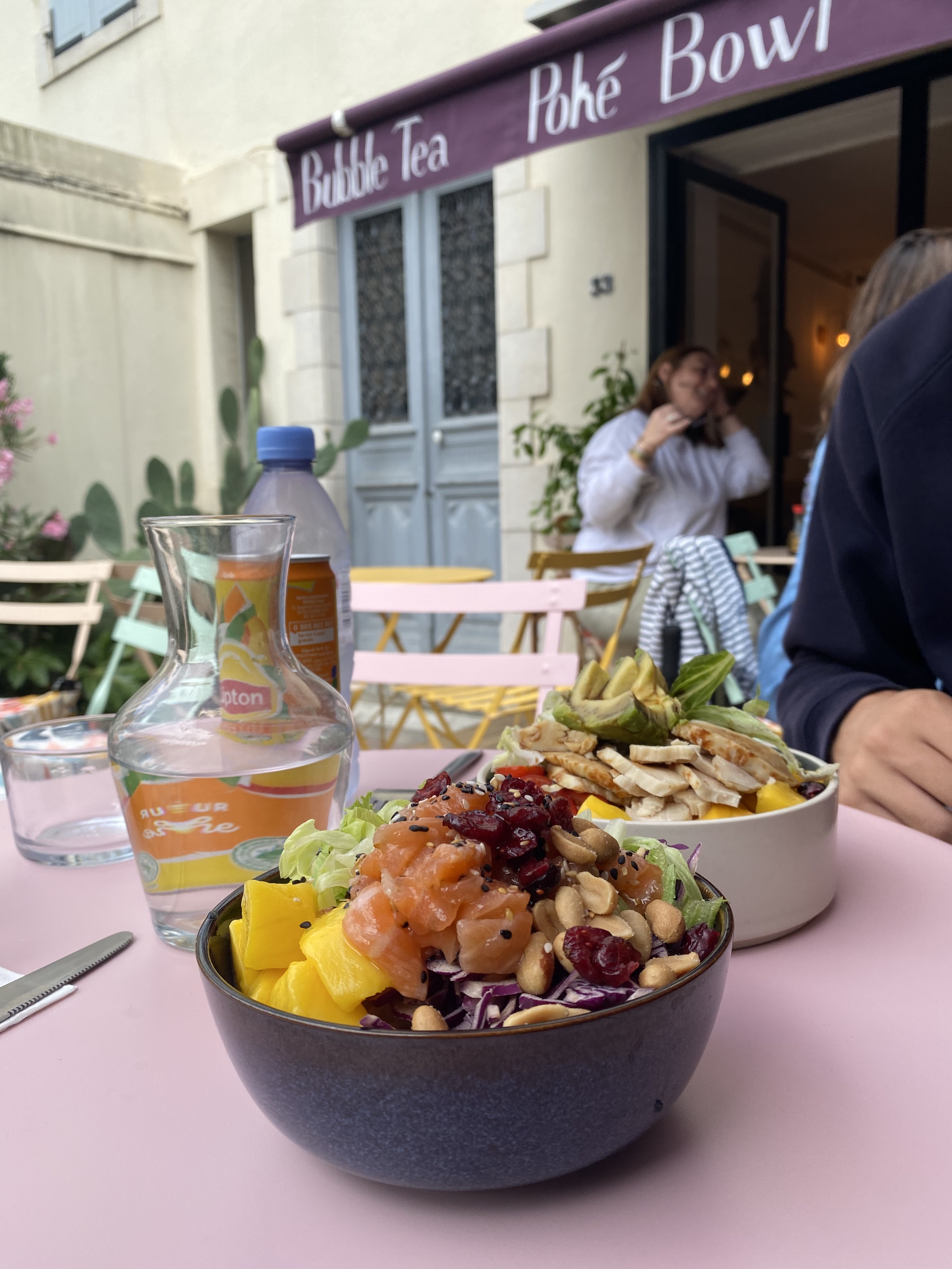 Super bon poké! Tombées dessus par hasard vers 14h, on a pu profiter d'un déjeuner au soleil servi très rapidement, accompagnés d'une carafe d'eau au concombre rafraîchissante 😊