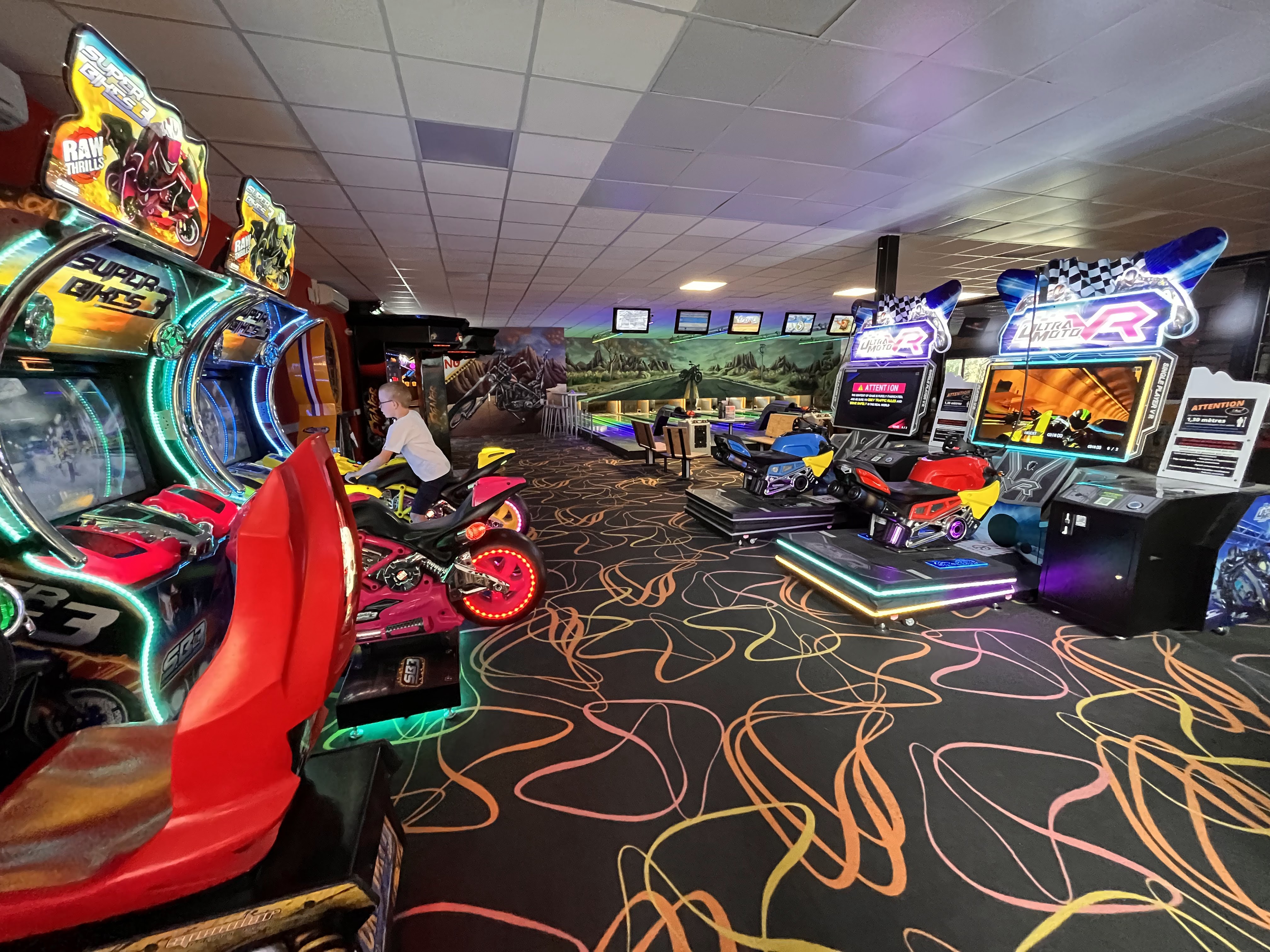 Sympas ambiance musicale et bowling moderne, beaucoup d'attente, doit déménager dans l'année, à voir si cela améliorera l'attente avec plus de piste. Beaucoup de jeux pour attendre la piste et enfants bienvenus avec des jeux à leurs niveaux.