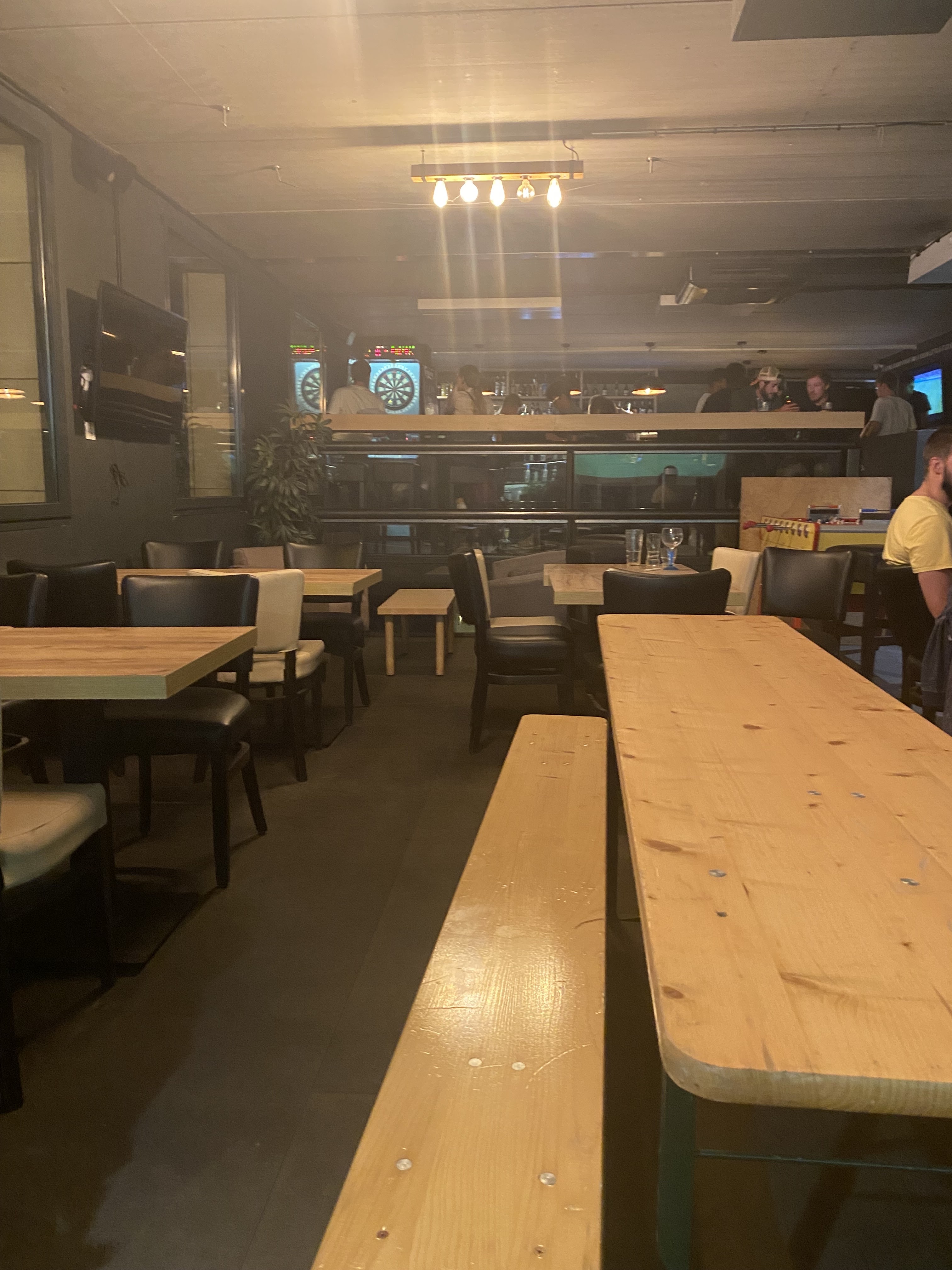 très sympa comme bar, on peut jouer au baby foot aux fléchettes, faire un blind test etc... et la cave est spacieuse et sympa, parfait pour des fêtes d'anniversaire ou pour regarder des matchs avec ses amis