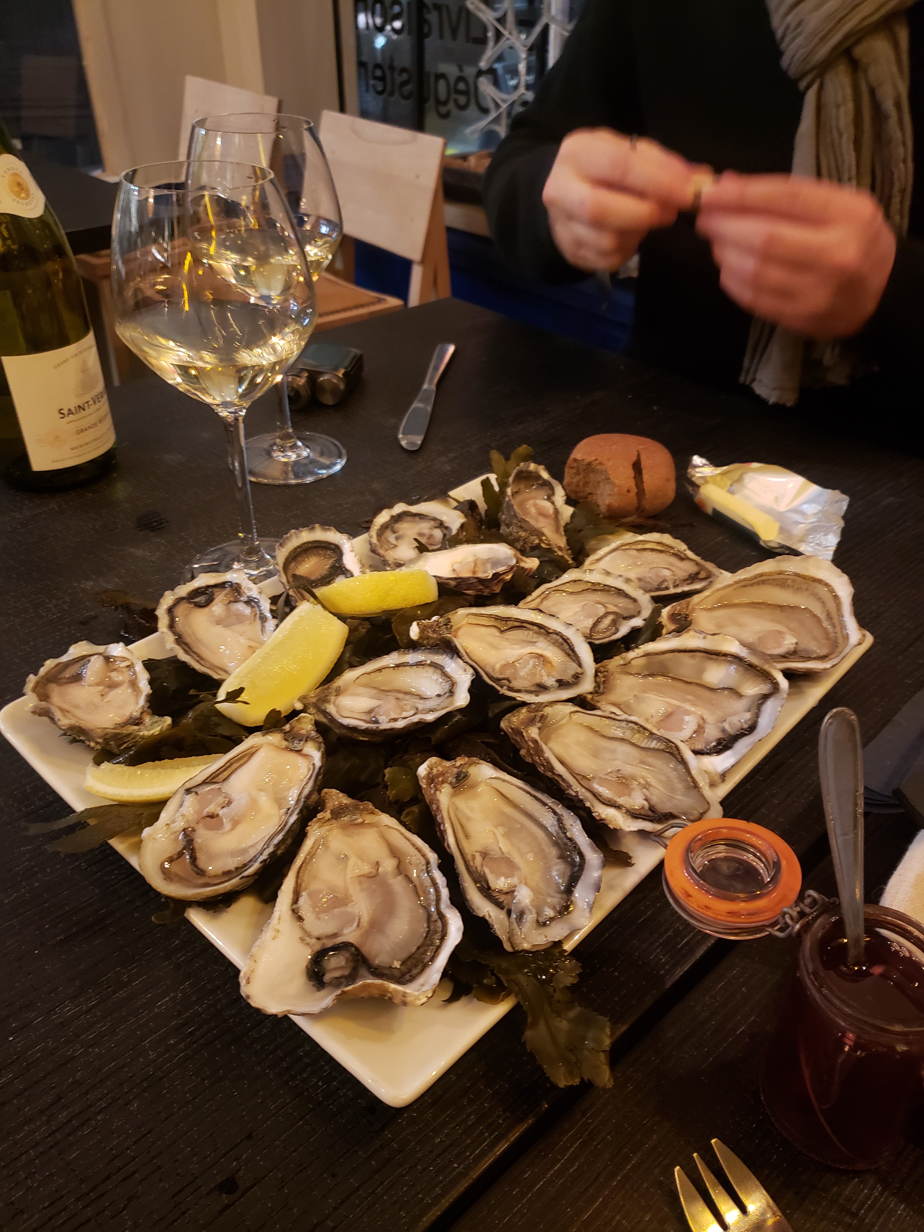 Derrière une petite devanture, un petit restaurant spécialisé dans les huîtres, les huîtres que nous avons dégustées étaient fraîches et délicieuses, tout cela accompagné d’une sauce à l’échalote qui a eu le temps de mariner dans le vinaigre, de citron et de pain beurre ; une bonne sélection de vins blancs et rouges pour les accompagner ; nous avons tentés par un verre de ratafia, un apéritif champenois que l’on trouve rarement dans un restaurant, au final, une très bonne expérience !
