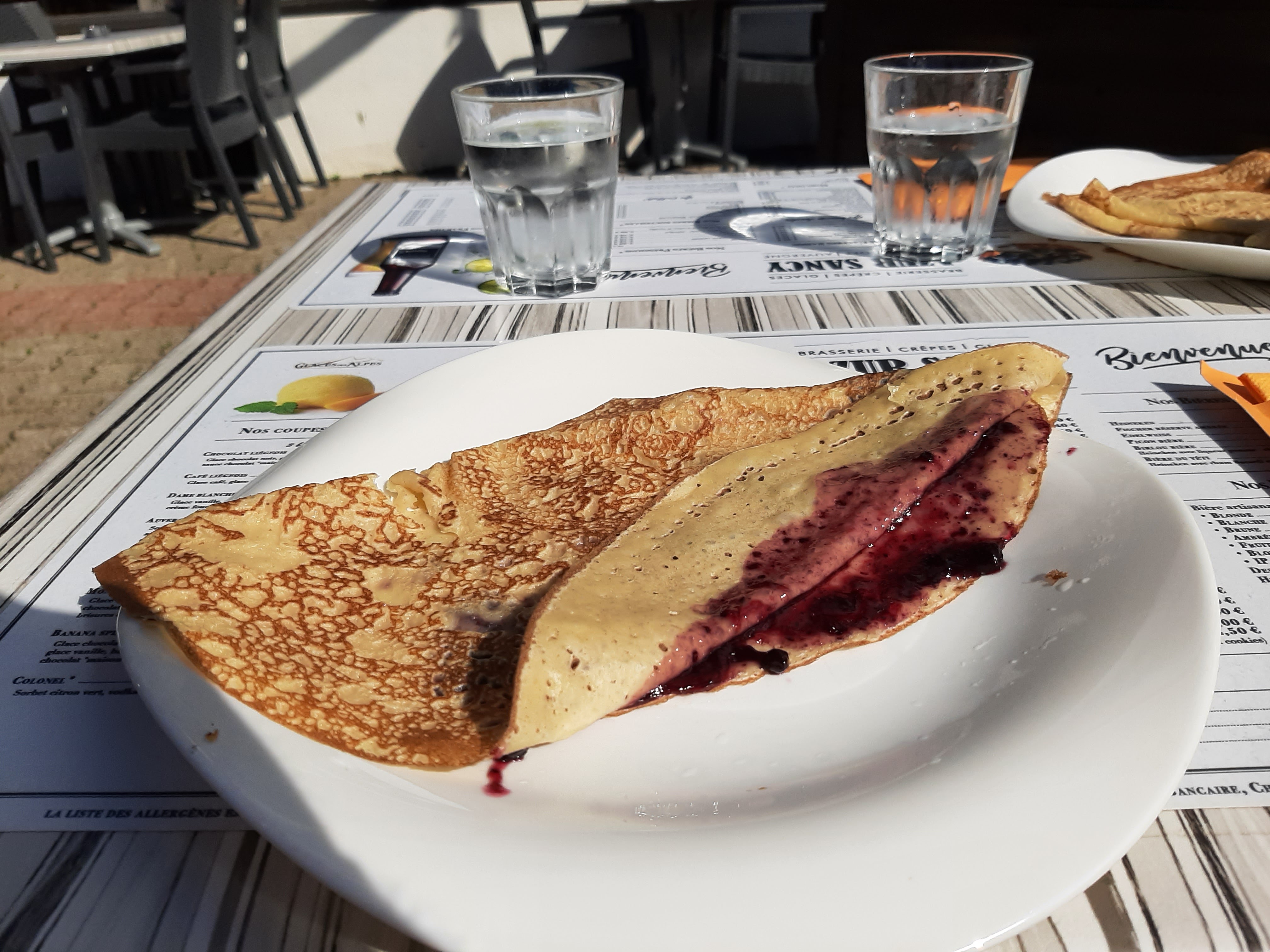 Petite pause goûter au pieds des pistes, endroit agréable en terrasse un peu gâché avec une musique étrange...passons. nous avons pris des crêpes, qui paraissent franchement industrielles, elles se coupent pas mais s effritent tellement elles sont sèches bref je recommande pas pour ça en tous cas.