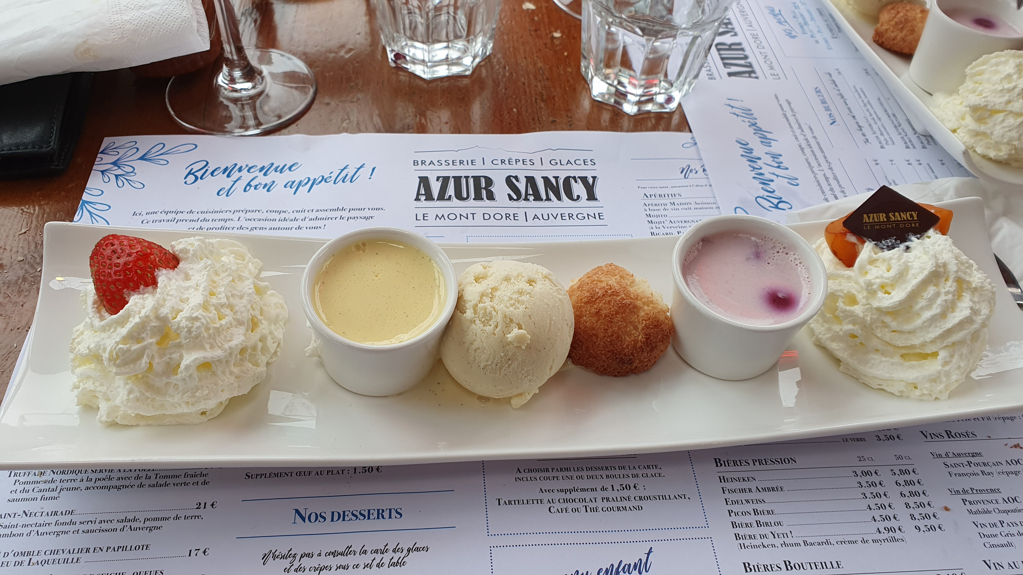 Déjeuner parfait, menu plat + dessert à la carte avec un petit supplément pour le café gourmand... Vu panoramique sur le téléphérique du Puy de Sancy et sa cascade sur sa droit. Je recommande cette brasserie Azur Sancy.