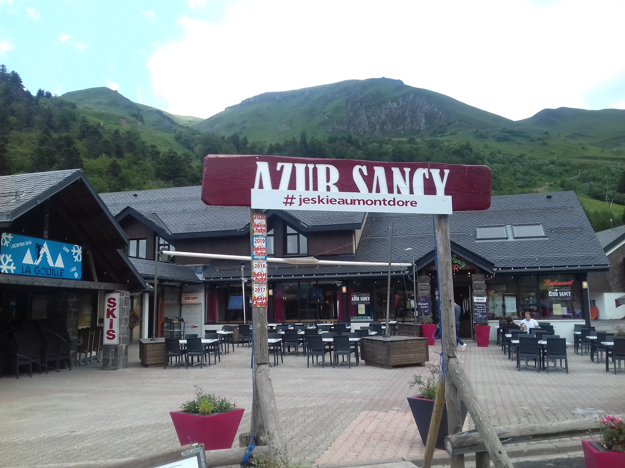 Terrasse au pied du Mont d'Or et du départ des randonnées vers le Puy du Sancy. Panorama de rêve. L'espace extérieur est ombragé et facilement accessible PMR ( parking à côté ). Service et accueil sympa , avec une nouvelle carte qui propose pas mal de choix de spécialités locales. Une bonne adresse que je recommande !!