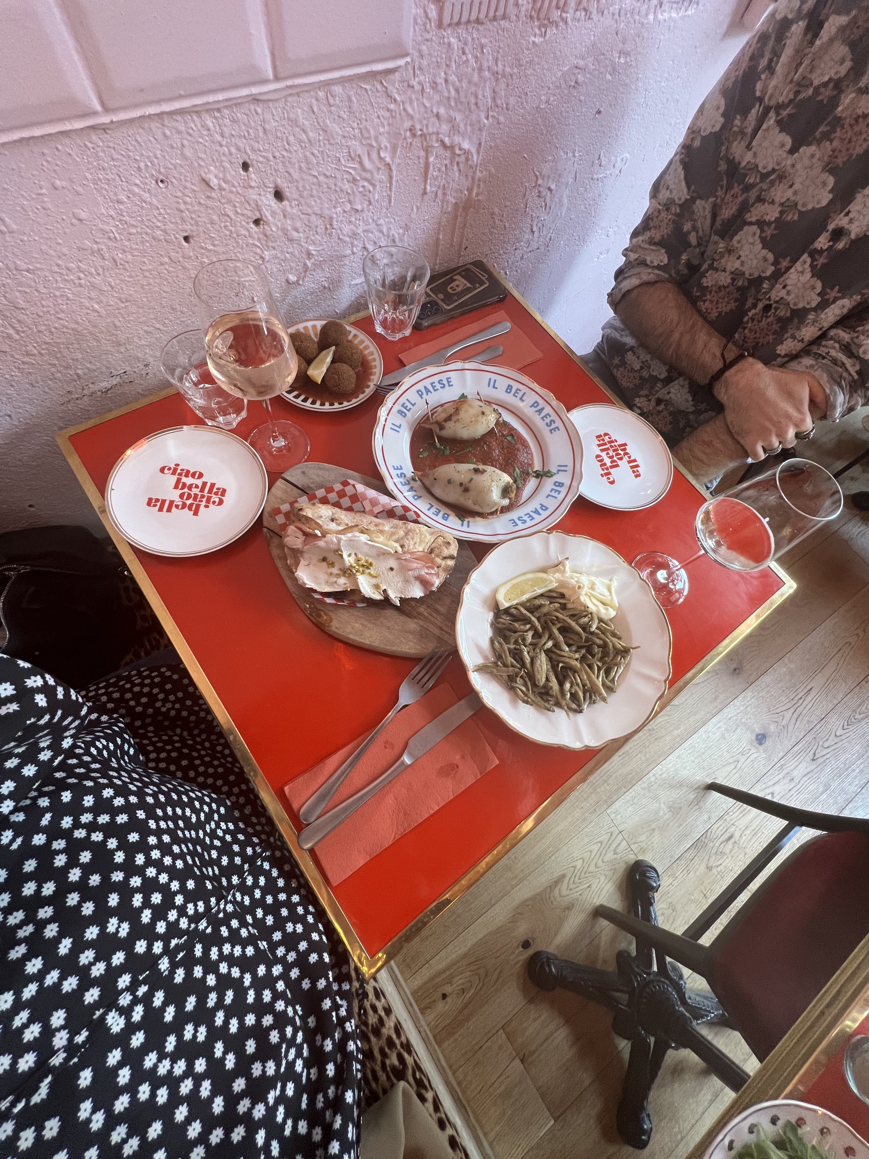 L'ambiance du bar est très sympa, comme une brasserie chic. La décoration est assez drôle, pleine de clichés italiens. L'offre de restauration est assez limitée, certains plats intéressants ne sont disponibles que pour plus de 3 personnes. Nous n'étions que 2 donc nous sommes allés prendre l'apéritif, les plats sont assez petits pour le prix. Mais le goût est très bon. Il me manque une bonne planchette de fromage italien et du salumi à partager entre 2 personnes. J'ai goûté 2 verres de vin, Chianti et primitivo et ils étaient juste moyens, rien d'exceptionnel. Le service est très attentionné, parfois un peu trop, assez pressant. Ils venaient trop souvent demander comment les choses se passaient ou essayaient de retirer nos verres avant même qu'ils ne soient vides. Cependant, c'étaient des serveuses super sympas. J'aimerais revenir dans cet endroit avec des amis pour avoir l'opportunité de partager certaines des grandes offres. Cependant, je ne dirais pas que c’est un restaurant italien, c’est une brasserie française proposant des plats italiens.