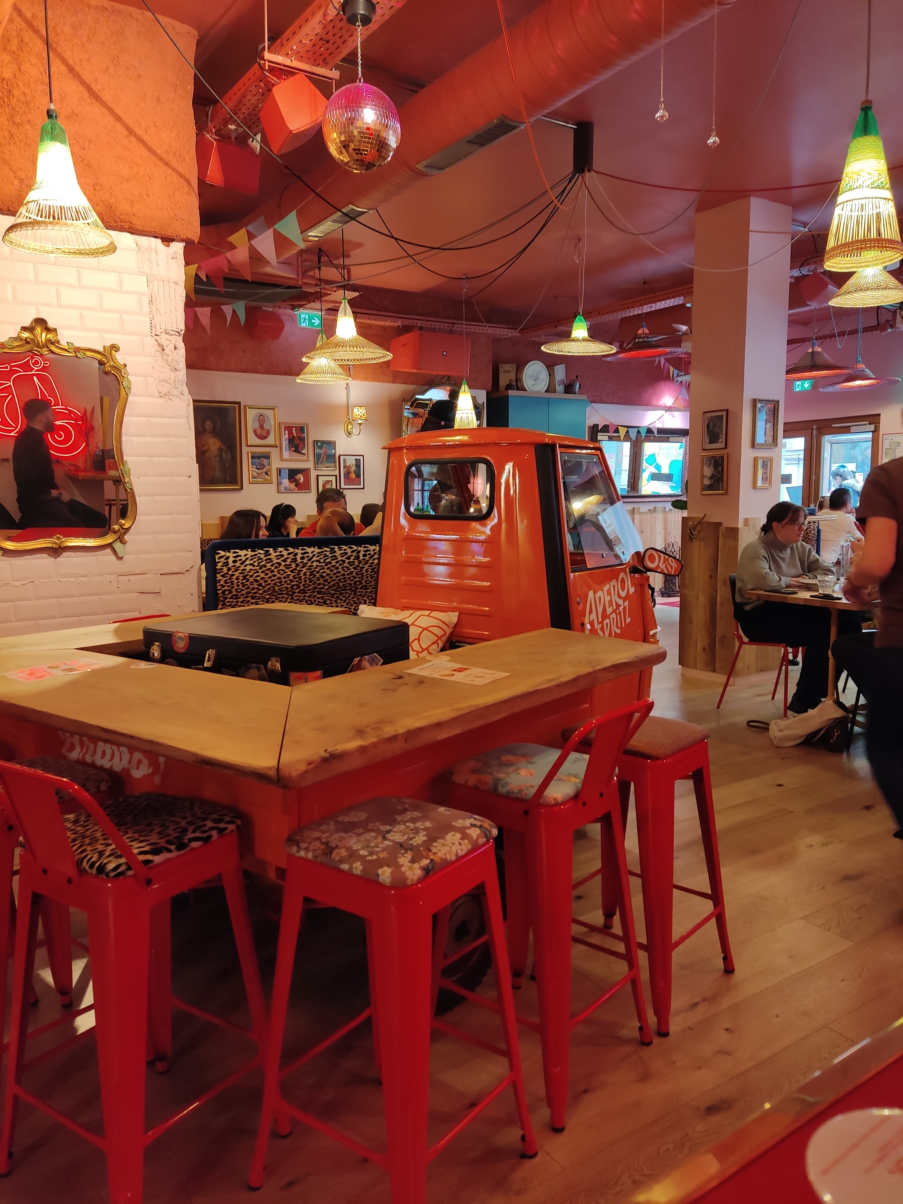Lieux 100% sympa et original. Beaucoup de paillettes pour entre autres une burrata au pesto sans goûts très fade mais le reste était ok. Lorsque le serveur demande si ca a été et que nous faisons part de notre avis très mitigé sur la burrata, nous avons un simple ah comme réponse... On a vu mieux niveau service client. Puis après ce commentaire on est jamais revenu nous demander autre chose et pas d'aurevoir après avoir payé. Dommage...