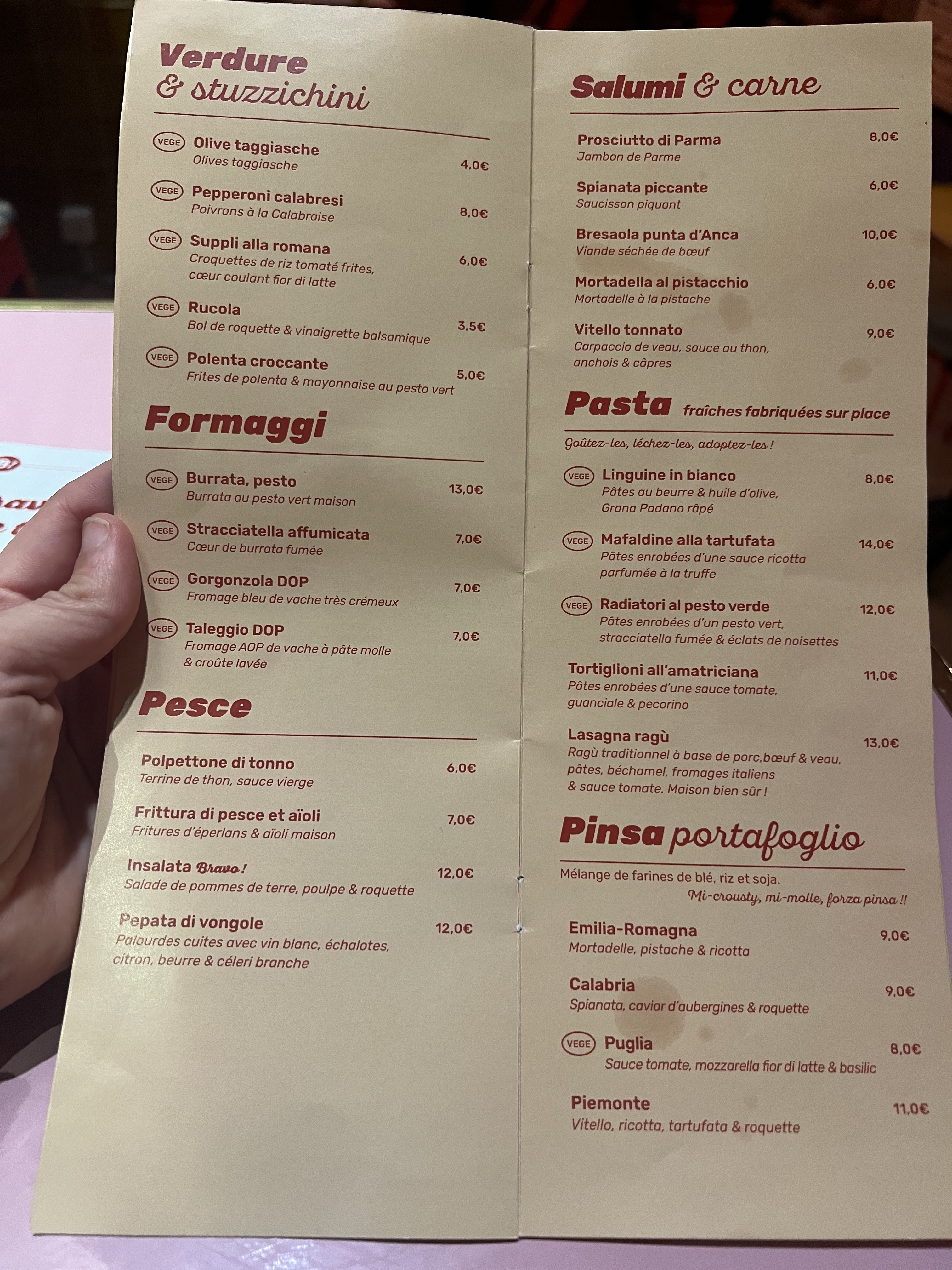 Un lieu et un concept vraiment sympa, une cuisine italienne savoureuse à des prix très abordables (la Pinsa était excellente), des serveurs et un manager très agréables !! Je recommande vivement ☺️