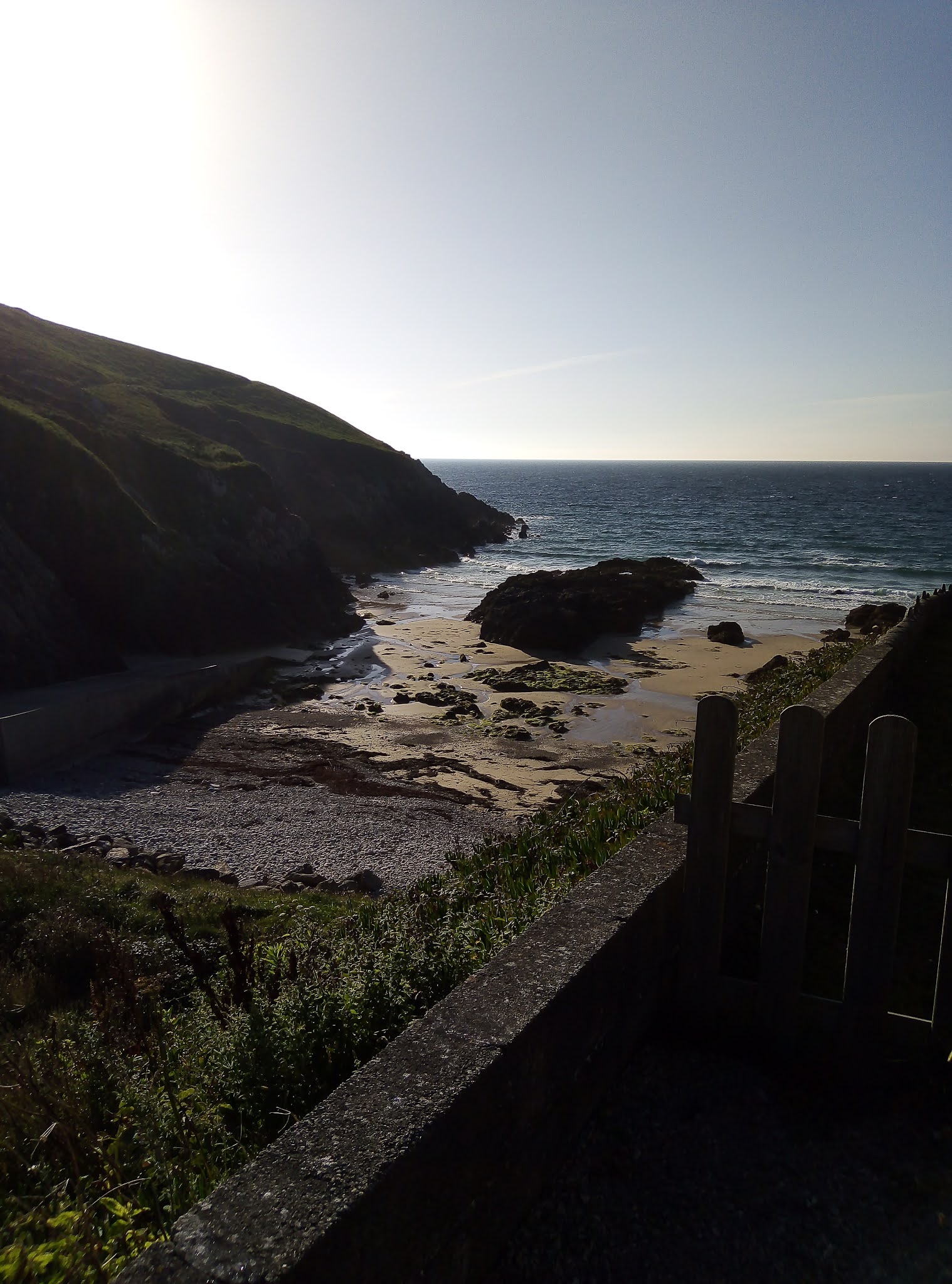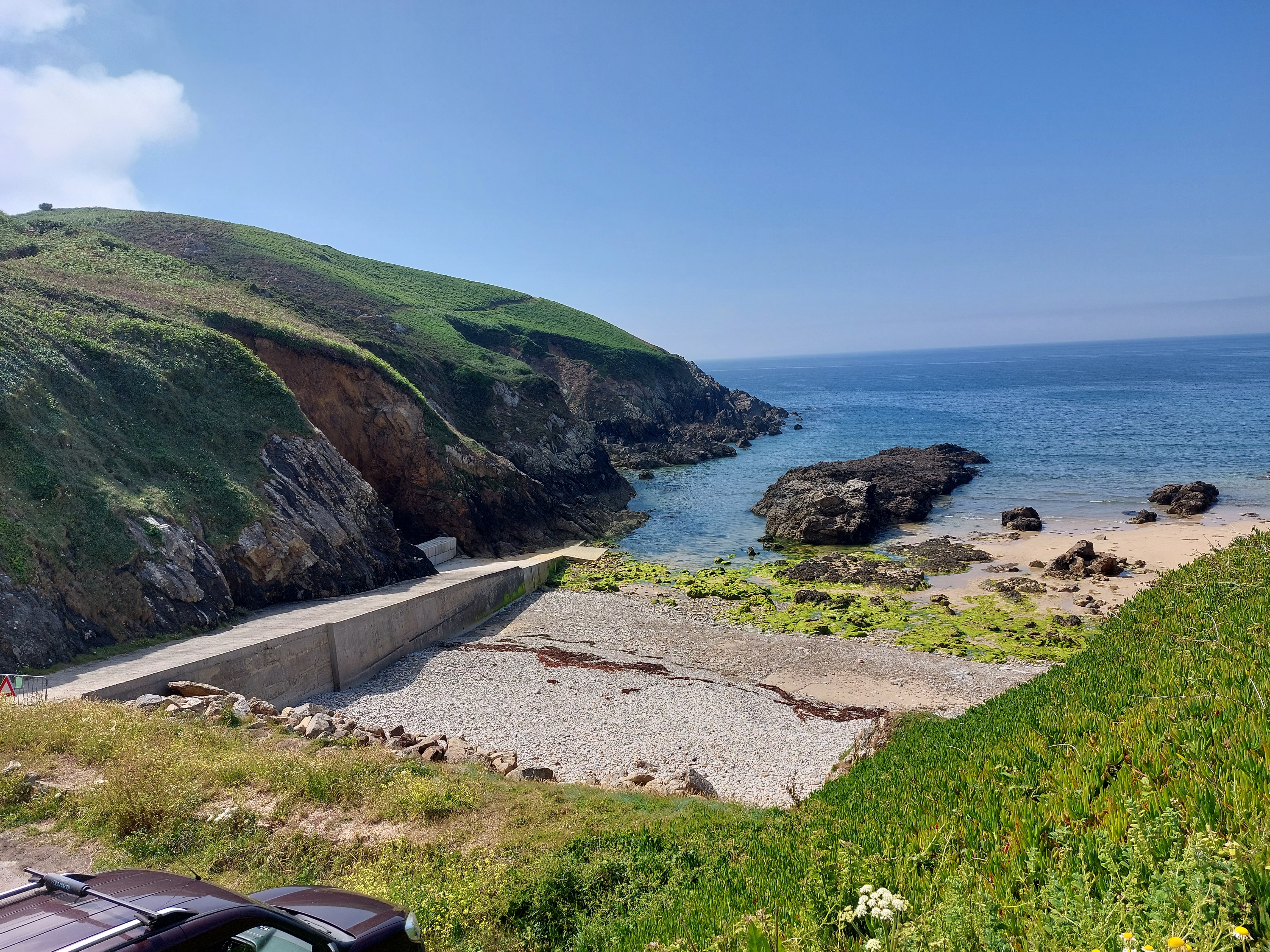 Endroit très sympa encaissé entre falaises, avec plage, rochers. Décor de bruyère et fougère.