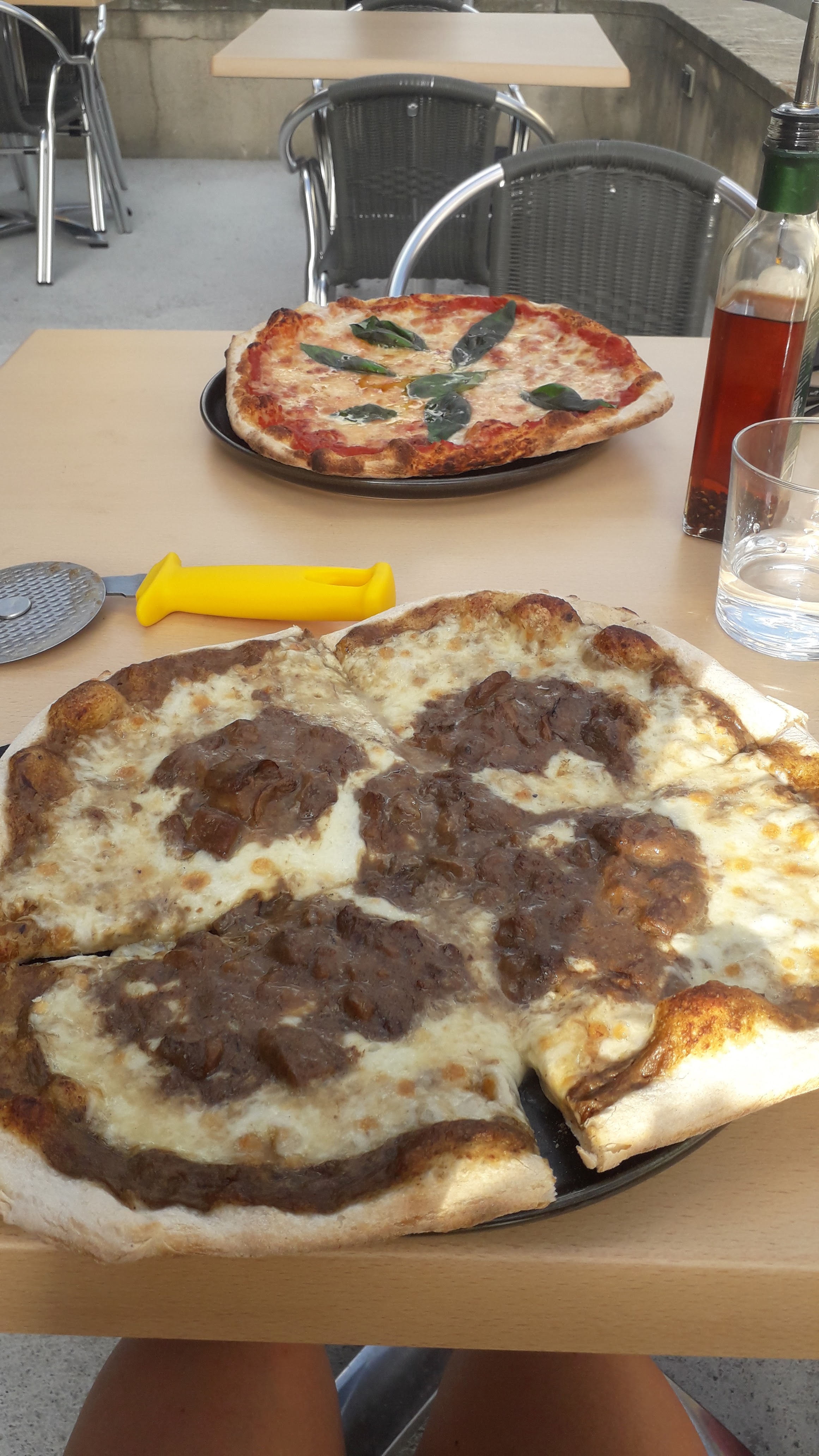 Les pizzas sont très savoureuses et la pâte est excellente ! Peut-être que j'ai juste raté quelques épices supplémentaires sur la pizza. Mais c'est définitivement un bon repas rapport qualité/prix 👍🏽 Et amener un petit chien n'a posé aucun problème