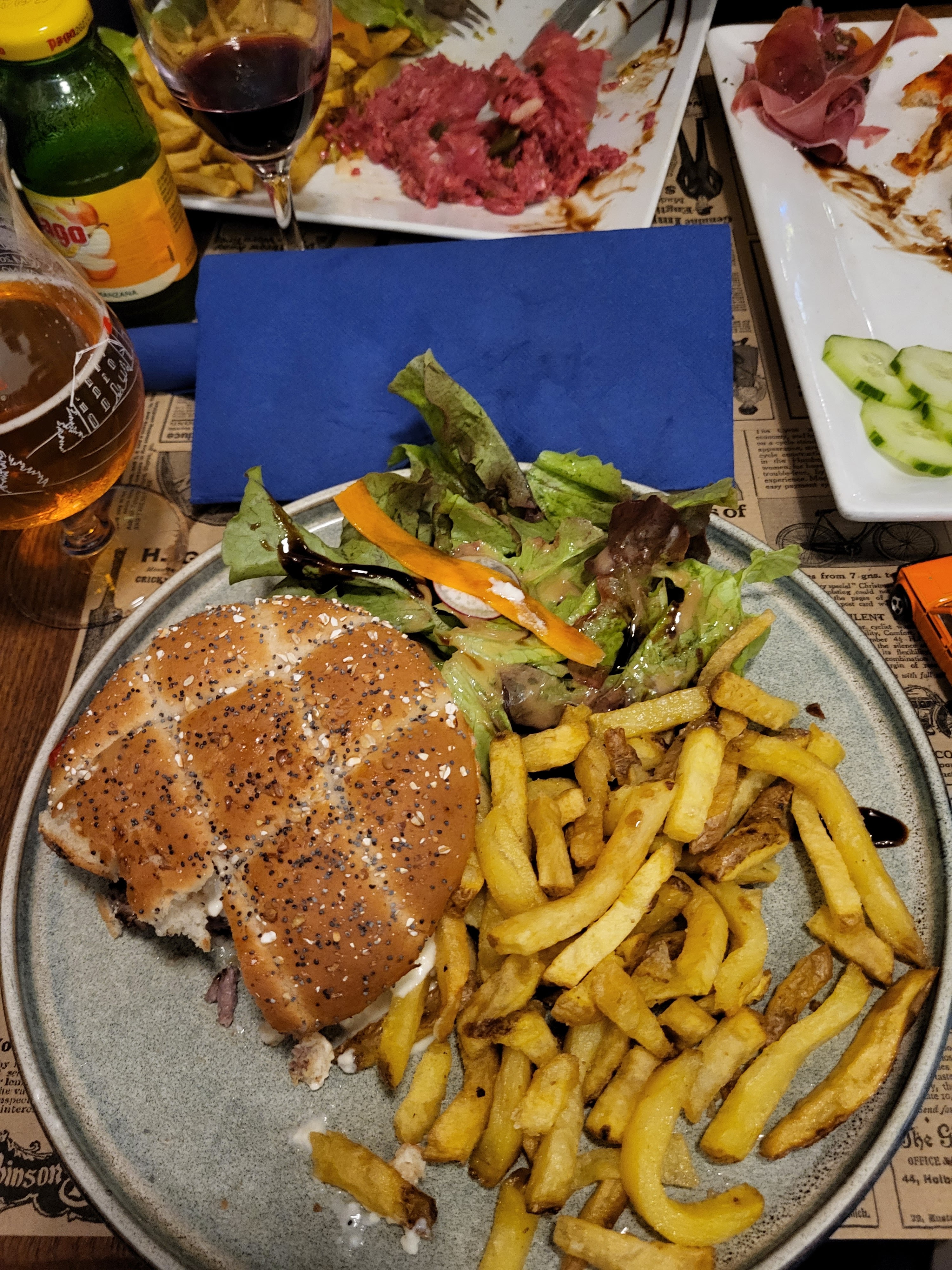 On y a mangé sur le pouce un dimanche à 15h La deco est très sympa Mais on vient quand même pour manger, un burger du jour avec un pain tellement cuit que c’était une biscotte, idem pour la viande et le fromage. Le foie gras maison et camembert au four étaient bien, mais les frites « maison » manquaient vraiment de cuisson. Malgré l’heure c’était pas dingue. Je ne conseille pas