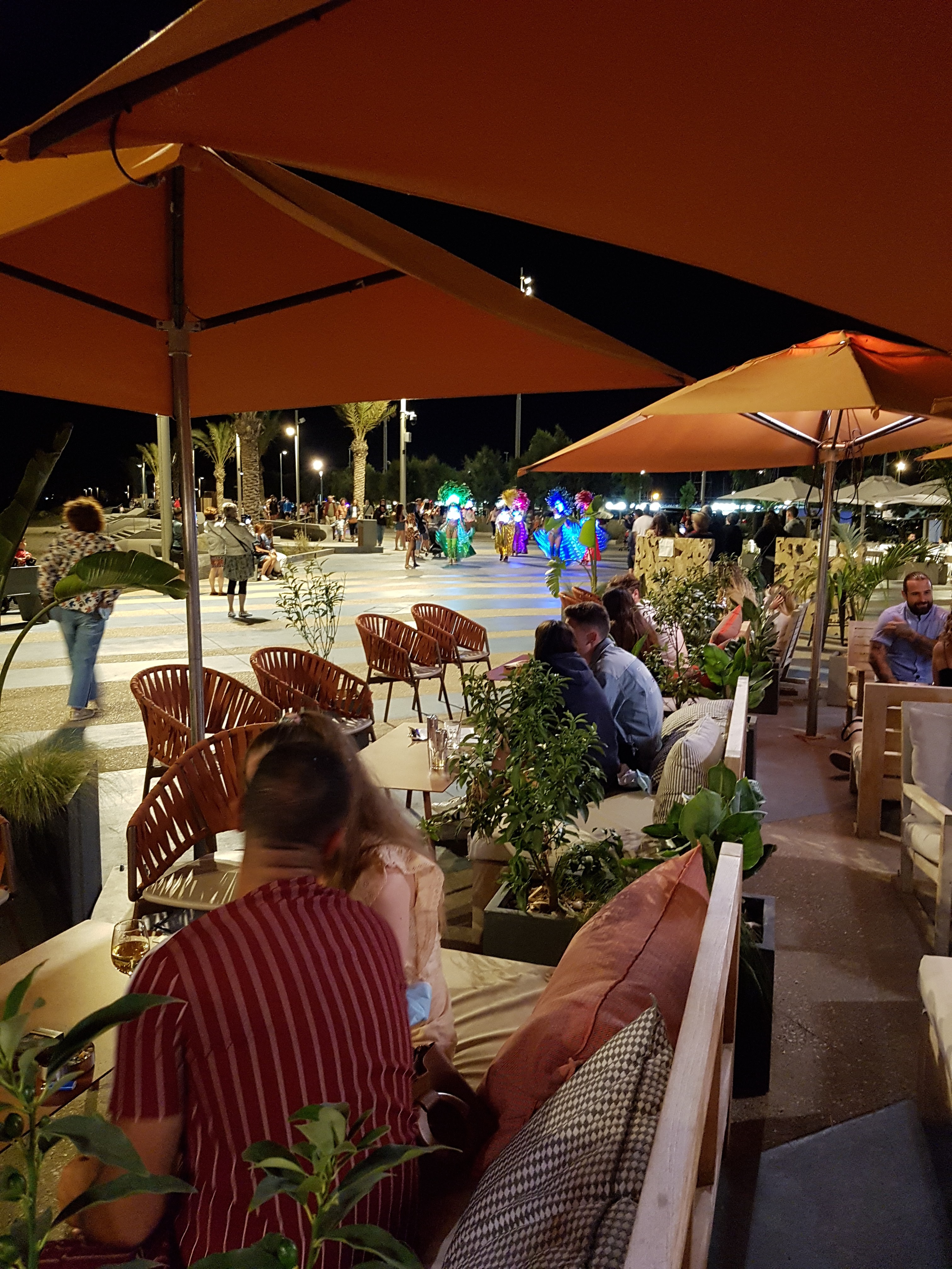 Bcp de places, différentes façon de mangé (mobilier), personnels souriant et Pro, musique en fond (pas trop fort et varié), très bonne qualité des produits et très bien assaisonné, public différent en fonction des tranches horaire, concerts, prix raisonnables (face à la mer, la grande motte, produits) 👍👍